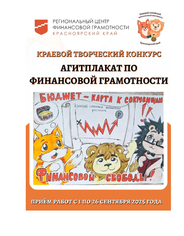 Приглашаем принять участие в творческом семейном конкурсе «Финансовые истории моей семьи» семьи с детьми от 4 до 16 лет. Организатором Конкурса является Региональный центр финансовой грамотности при поддержке министерства образования Красноярского края, министерства финансов Красноярского края.
