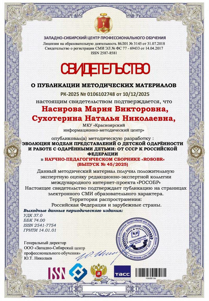 Свидетельство о публикации методических материалов на тему «Эволюция модели представлений о детской одаренности и работе с одаренными детьми: от СССР к Российской Федерации».