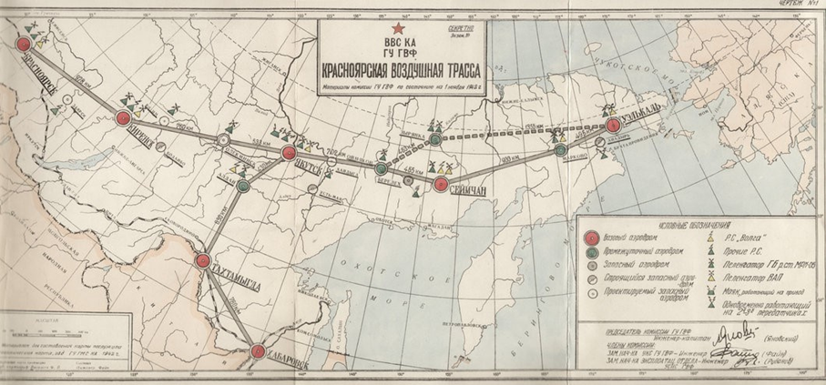 Для перегонки самолетов была создана секретная воздушная трасса «Аляска-Сибирь» — она же Алсиб, «Воздушная трасса Красноярск — Уэлькаль» или «Красноярская воздушная трасса». Решение о создании воздушной трассы с конечным пунктом в Красноярске было принято 9 октября 1941 года совершенно секретным постановлением Государственного Комитета Обороны СССР. Перегонять самолеты предстояло в очень тяжелых условиях, а у пилотов Енисейской авиагруппы.