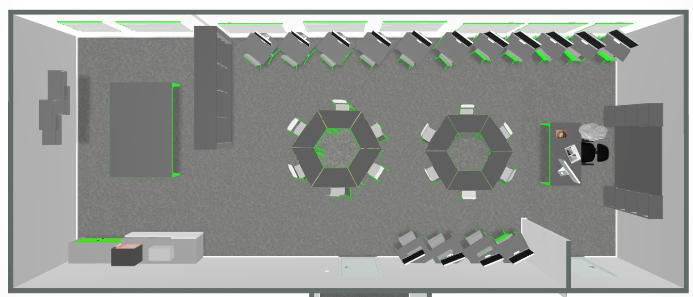 · Первая зона – основное пространство рабочего кабинета – оснащена современным компьютерным оборудованием с установленным программным обеспечением (Paint, Компас 3D, Scratch, C++). В качестве рабочей мебели выбраны мобильные трапециевидные столы, которые можно переставлять, исходя из целей групповой или индивидуальной работы. Для зонирования пространства между первой и второй зоной использован открытый стеллаж, предусмотренный для размещения итоговых работ обучающихся