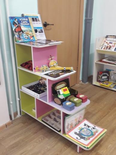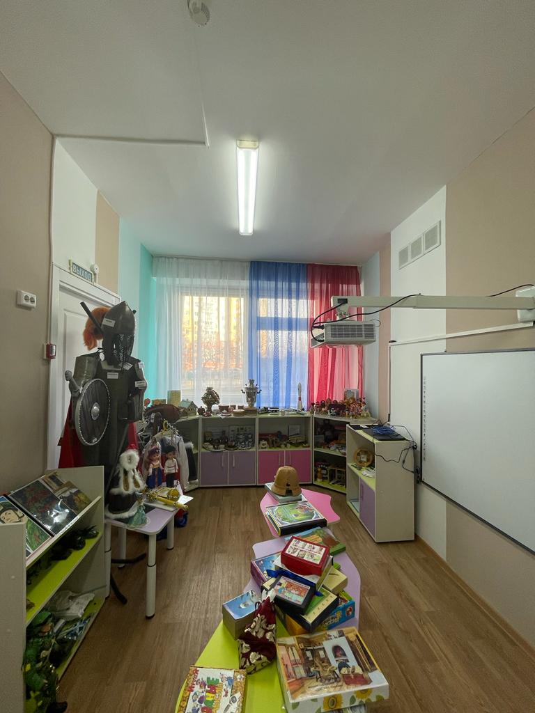 Интерактивное музейно-педагогическое пространство расположено в удобном и доступном месте, в отдельном помещении 1 этажа. Пространство зонировано, выделены: информационная – зона со стендами и стеллажами, образовательная зона – Smart доска, рабочая зона – трансформируемый стол со стульями).