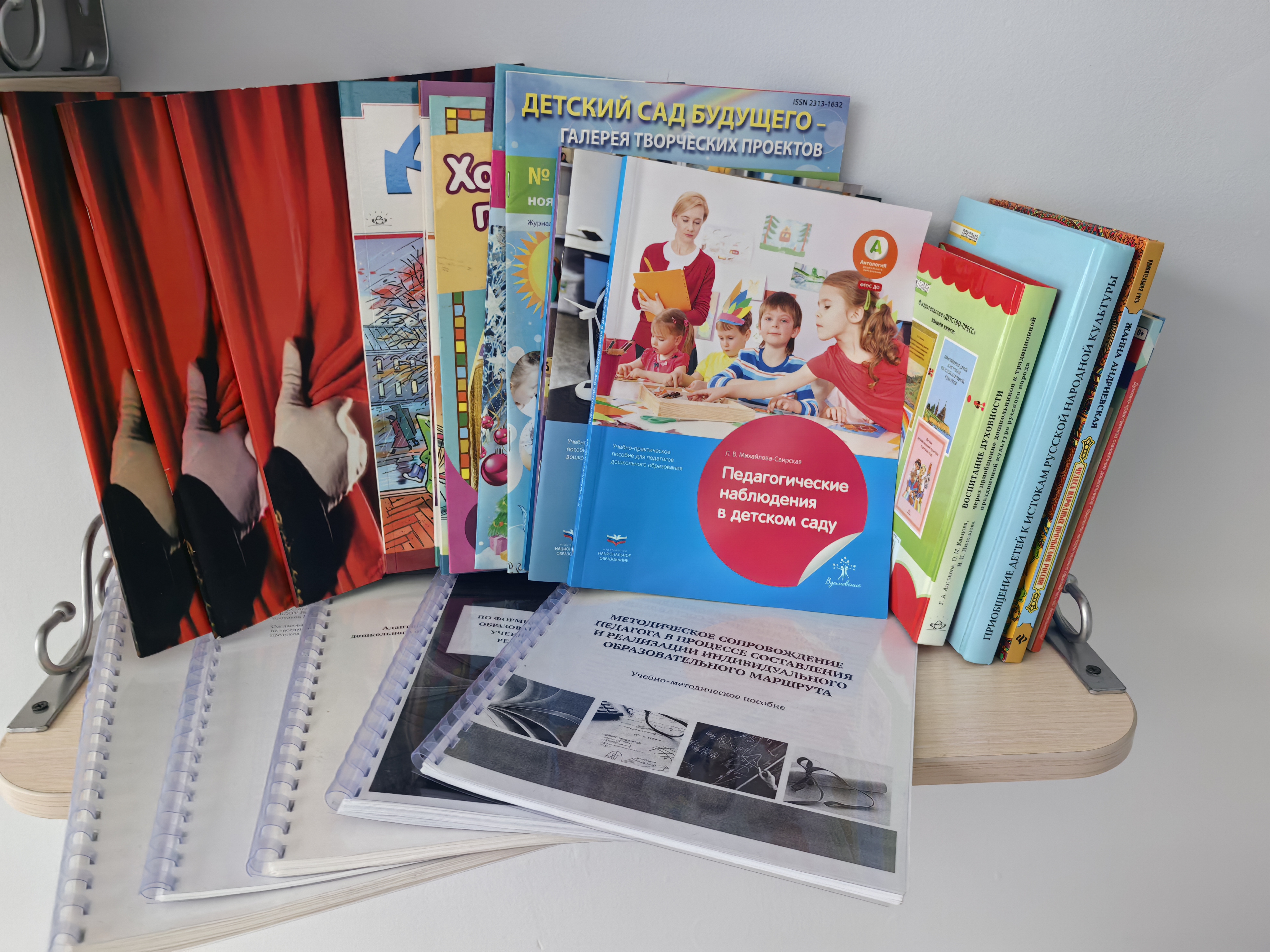 Также на стеллажах представлена методическая литература, печатные издания МАДОУ 74 и литература для родителей.