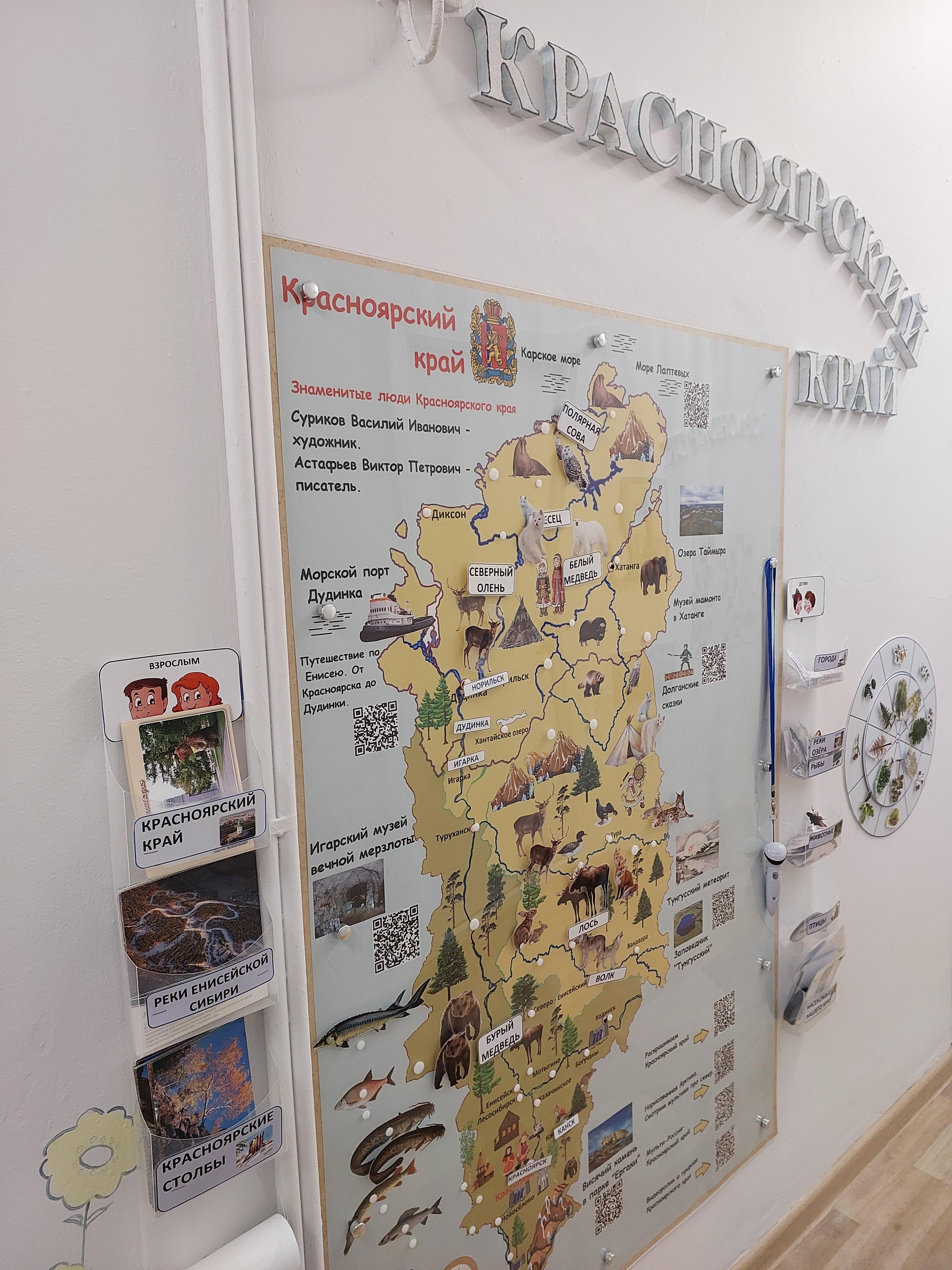 В образовательном пространстве ДОУ организована среда краеведческой направленности по тематическим линиям: Красноярский край и город Красноярск. Разработан и создан дидактический, демонстрационный, игровой современный и актуальный материал.