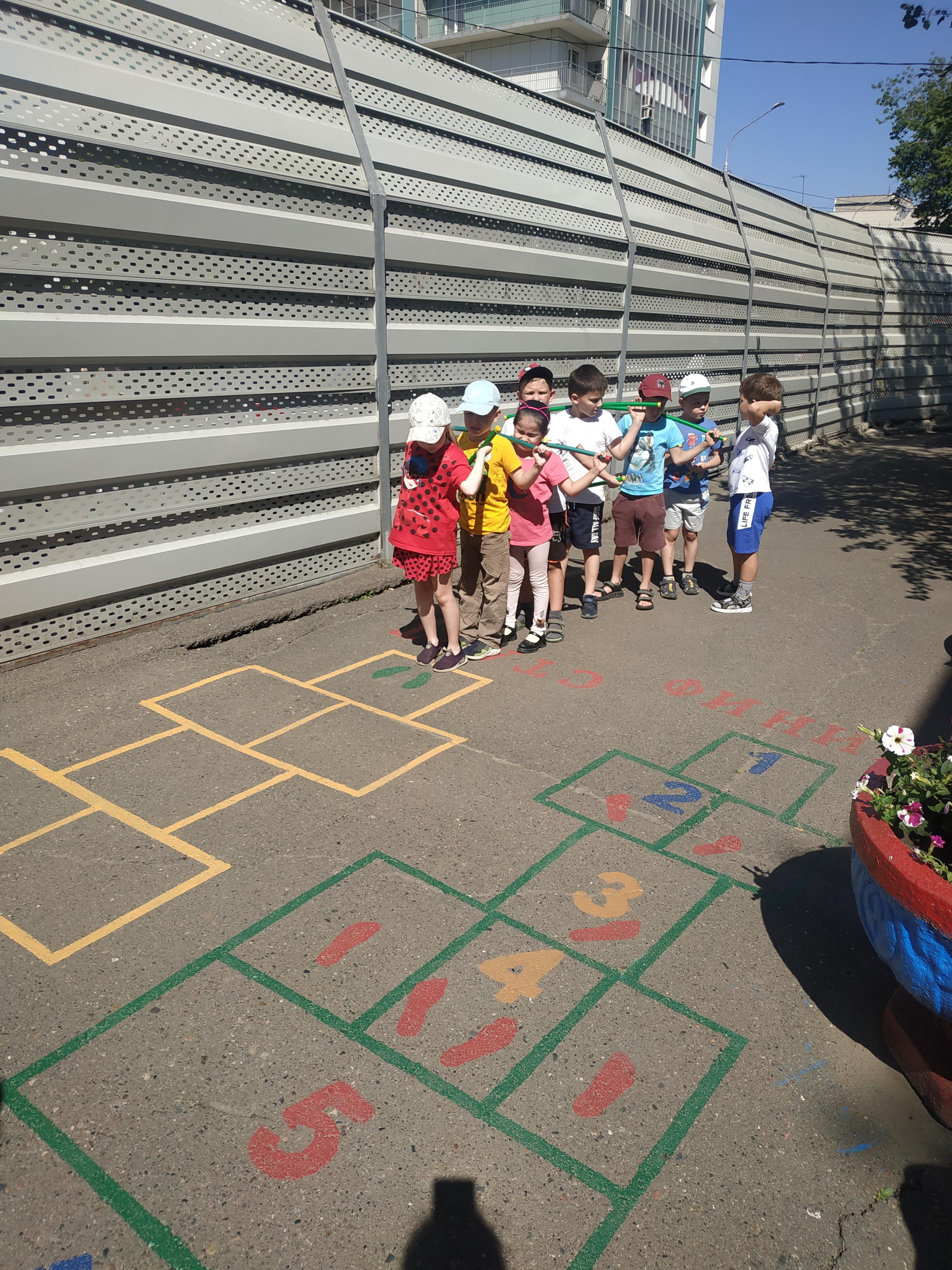 1. Решетчатые «классики». -прыжки на одной, двух ногах. -метание в цель (биток кидают в клеточку)