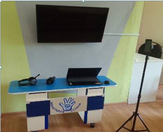 Инфраструктурное решение «Телеканал «Маленькая страна» расположен на 1 этаже в холле. Помещение оборудовано как маленькая телестудия: есть стол, за которым ведущие выпусков проводят эфиры, микрофоны, штатив с видеокамерой, осветительные приборы. Также расположен компьютер, на котором дети, совместно с педагогом отсматривают снятый материал и монтируют либо выпуски новостей, либо видеоролики на заданные темы. Имеется стол и доска для записей идей. Рядом расположена творческая лаборатория, где ребята изготавливают атрибуты для выпуска передач.