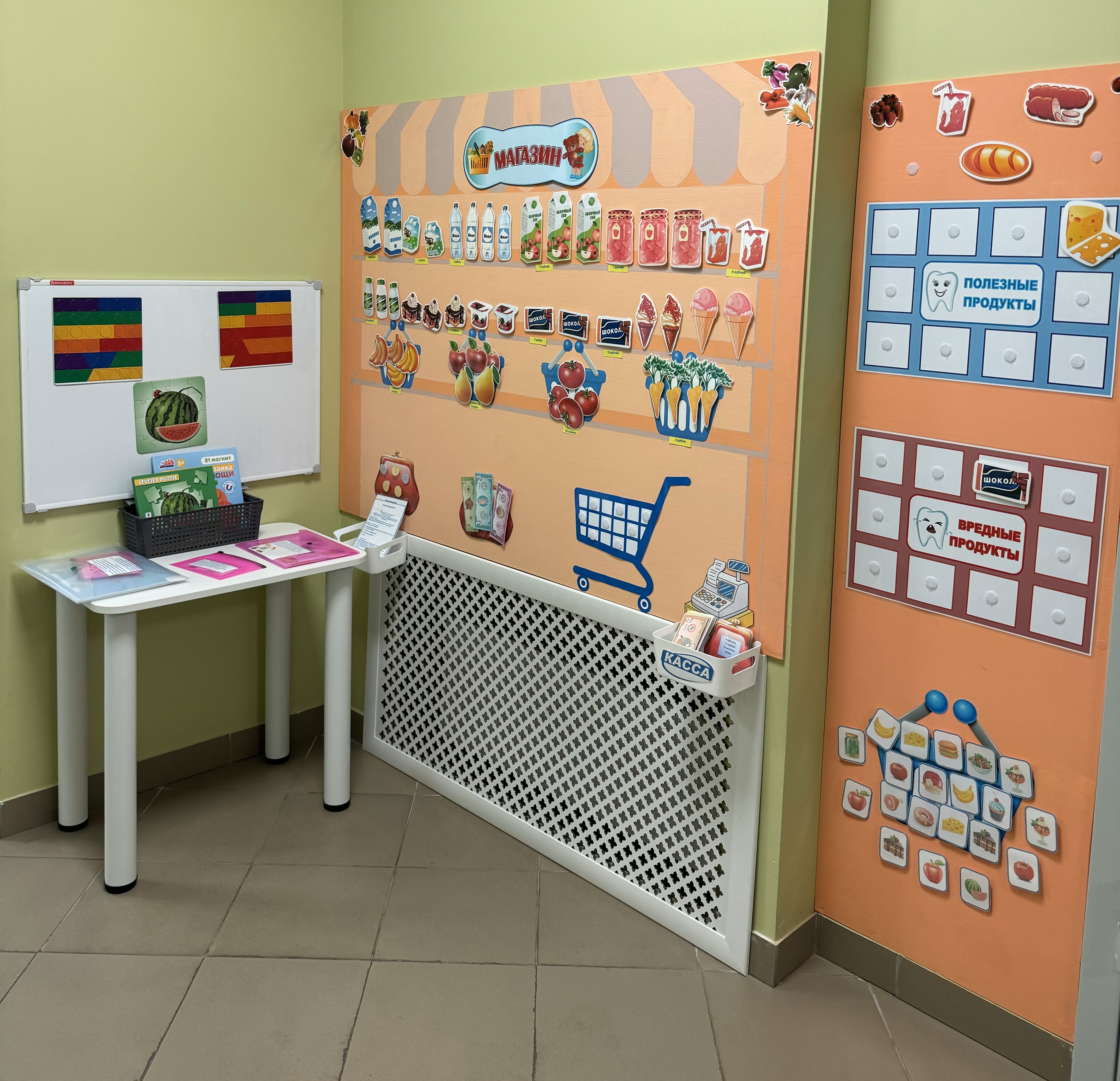 К каждой локации разработаны методические пособия для педагогов с вариантами развивающих занятий. Локации оборудованы пластиковыми кармашками для размещения информации для родителей. Пока мамы и папы будут знакомиться с важными документами, малыши будут заняты развитием: на уровне их роста размещены интересные тактильные дорожки; тематические бизиборды, которые развивают мелкую моторику; различные задания, которые способствуют развитию логического мышления, внимания, памяти, речи и математических способностей и т.д.