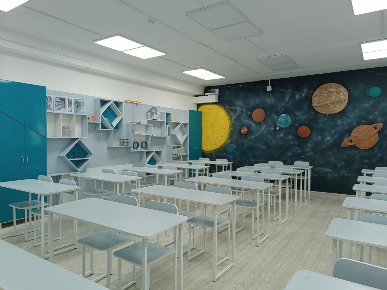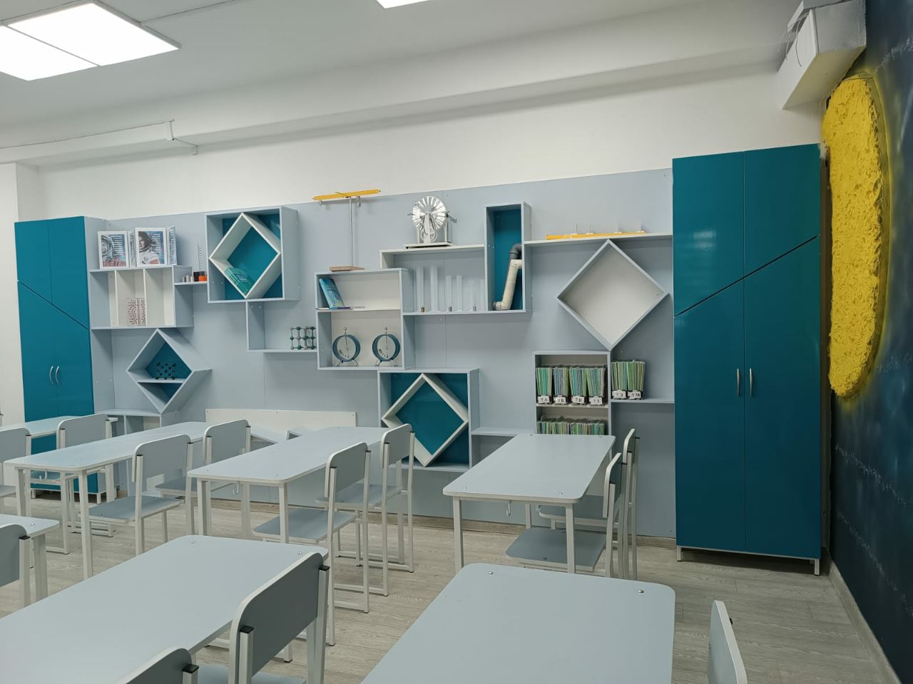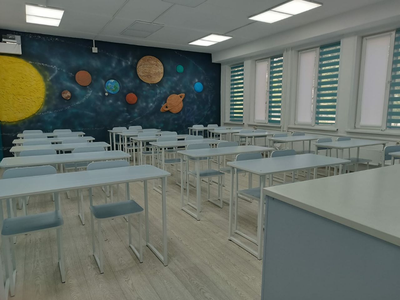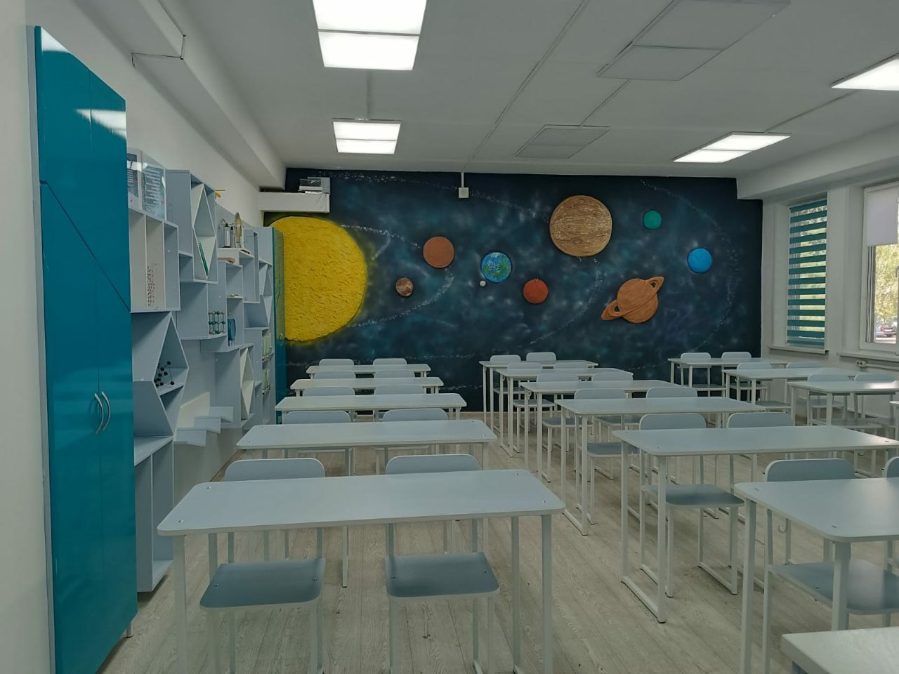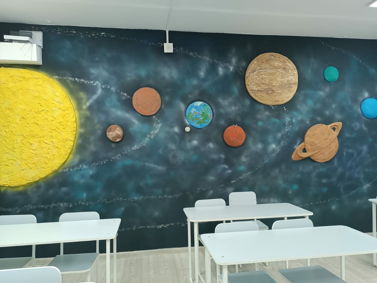 Дополнительное оснащение кабинета: шкаф-стеллаж для хранения и демонстрации учебного оборудования, учебных пособий, проектных работ, тематическая стена с планетами Солнечной системыОбразовательная деятельность в кабинете физики направлена на формирование естественнонаучной грамотности обучающихся и изучение физики в деятельностном залоге. Программа по физике устанавливает распределение учебного материала по годам обучения (по классам), предлагает примерную последовательность изучения тем, основанную на логике развития предметного содержания и учёте возрастных особенностей обучающихся. Программа рассчитана на учебный год – в 7-8 класса – 2 часа в неделю, в 9 классах - 3 часа в неделю, дополнительно 2 часа для подготовки к ОГЭ и 2 часа на каждую параллель для подготовки к олимпиадам, проектам и исследовательским работам.
