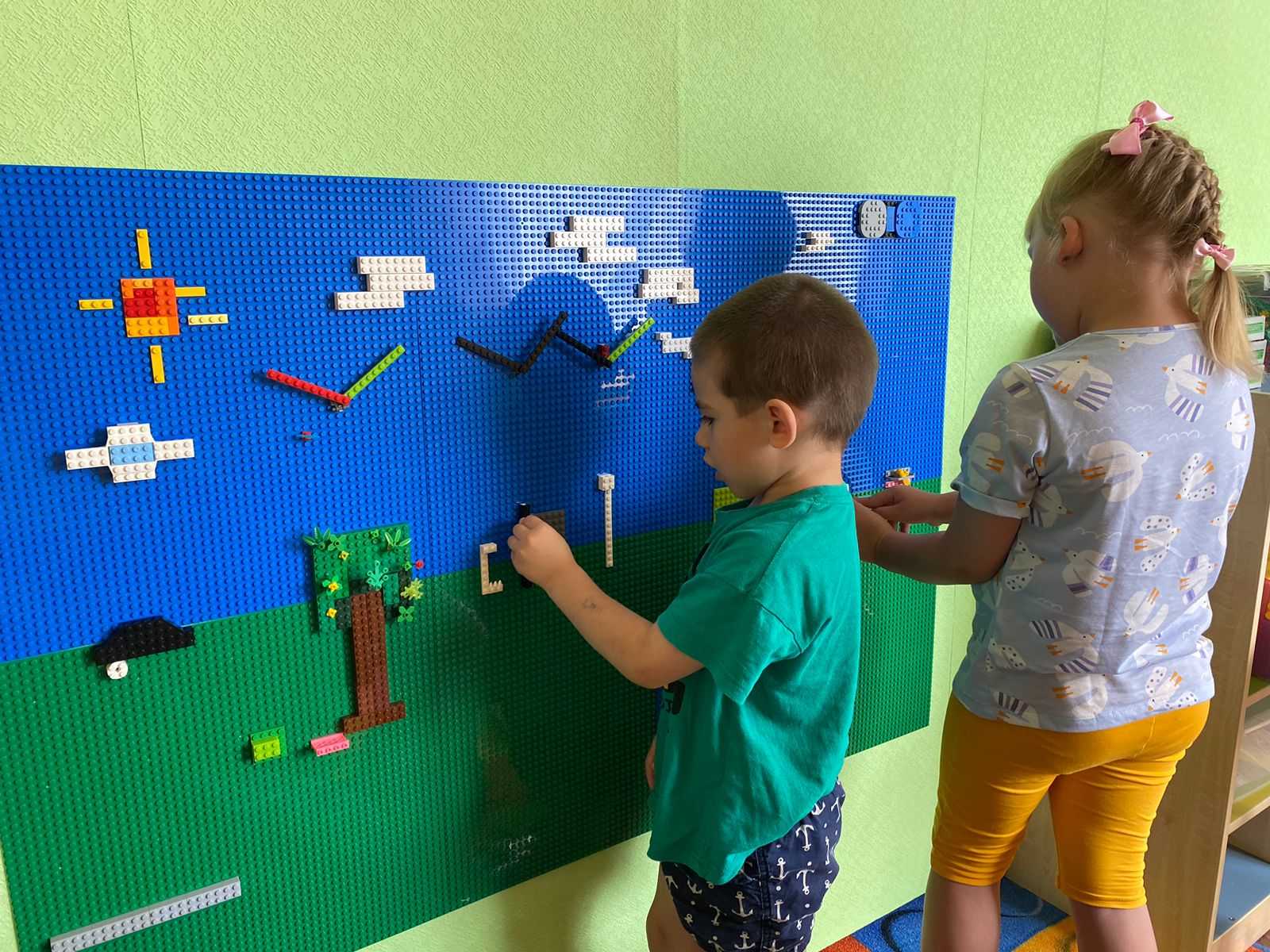 -Пространство «Конструкторские фантазии»: большая настенная панель ЛЕГО (для создания панно, построек из ЛЕГО и аналогов), место отдыха и игр с большим ЛЕГО и аналогами, яркое покрытие в стиле «ЛЕГО»