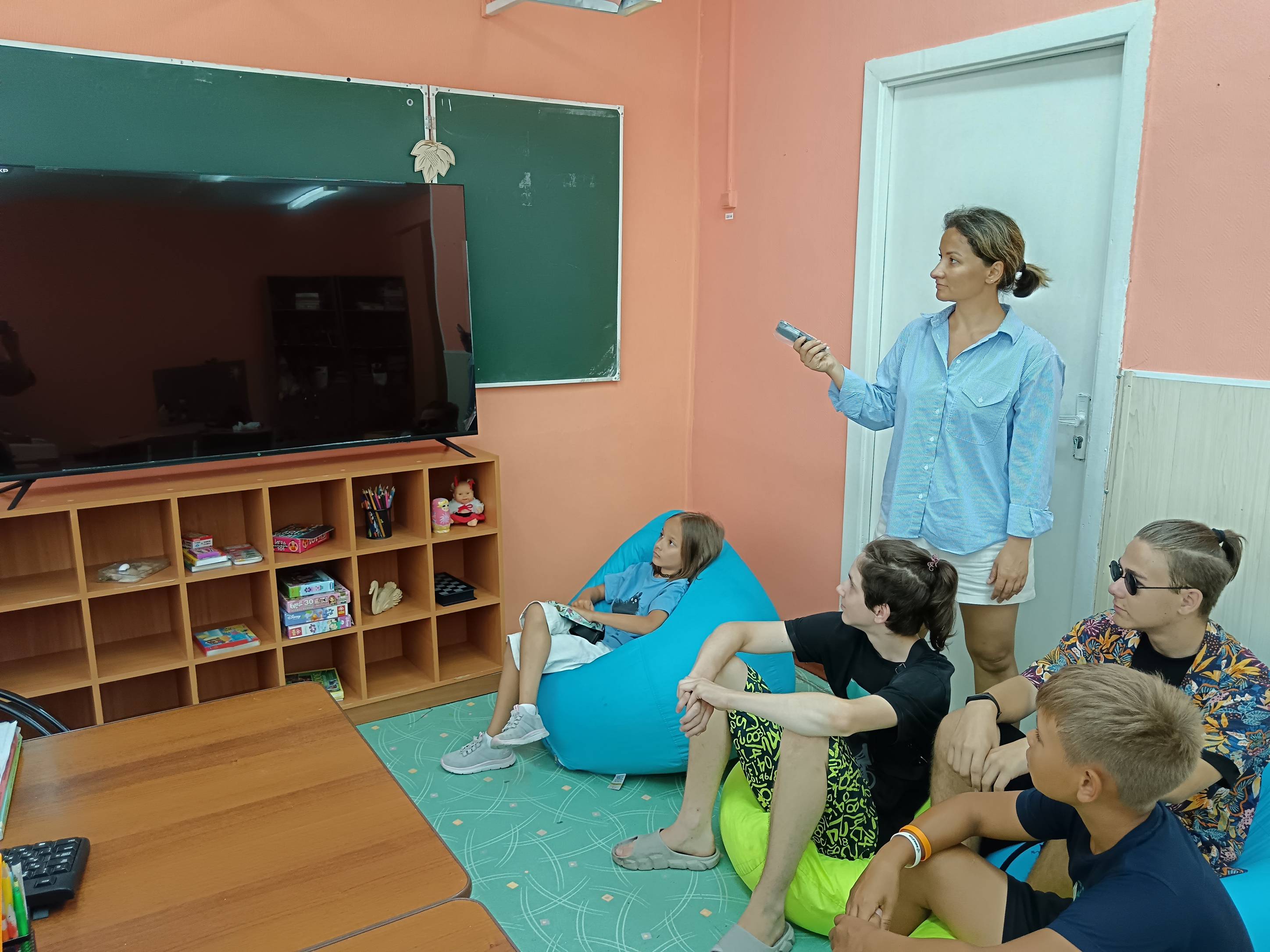 - Зрительная и звуковая среда (телевизор, пуфики, кресло-мешок, музыкальные инструменты, светодиодный шар). Спокойная музыка и медленно меняющиеся расплывчатые световые эффекты действуют успокаивающе и расслабляюще. Мульттерапия позволяет ребёнку, находящемуся в трудной жизненной ситуации, почувствовать себя полноценным человеком, почувствовать уверенность в своих силах, развить творческую активность, инициативность, самостоятельность, освоить средства самовыражения, скомпенсировать недостатки и проблемы коммуникации. Тем самым мульттерапия является моделью сотворчества взрослых и детей, задающей ориентиры для становления новой парадигмы образования.