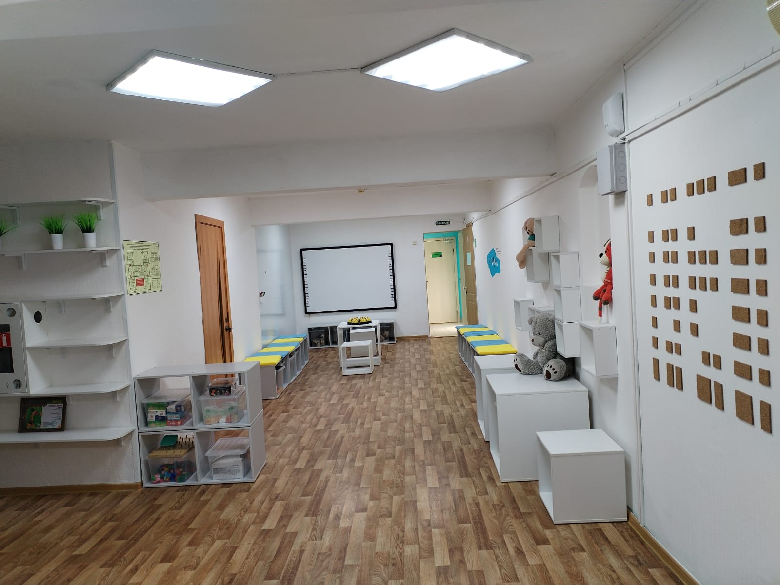 6. Здесь же находится зона для выставок и музейных экспозиций, обустроенная навесными полками, на которых каждый ребёнок может с гордостью представить свои достижения. Удобная организация выставок возможна с помощью любой имеющейся мебели. В дополнение, рядом с выставочной зоной располагается матрица для размещения рисунков и плакатов разного размера, продуманная до мелочей и оснащённая специальными крепежами.