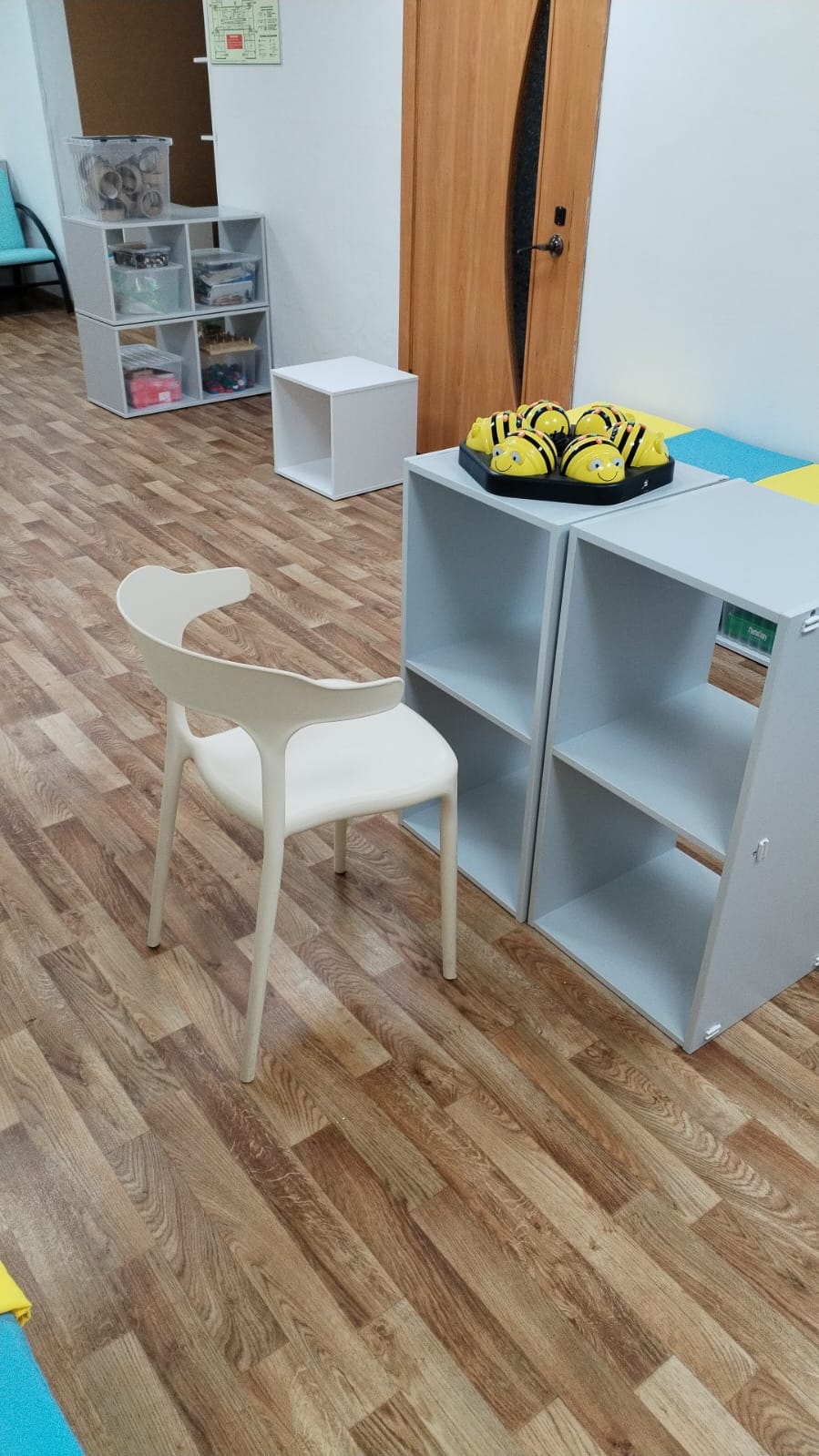 3. Все пространство лаборатории оформлено в серо-белых тонах, имеются цветовые акценты в тонах логотипа детского сада.