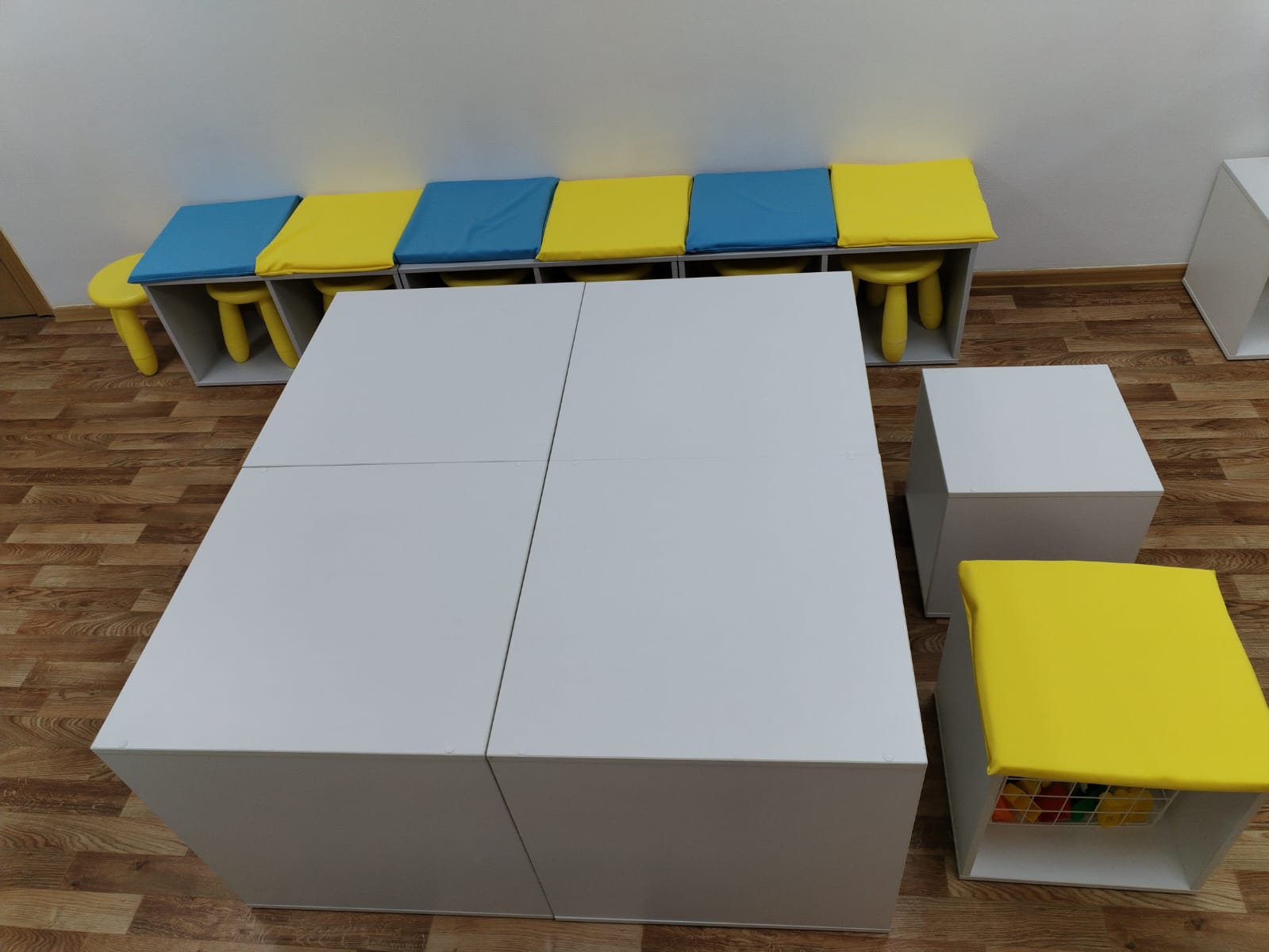 4. В лаборатории созданы идеальные условия для активного общения, но здесь также предусмотрены уютные уголки для уединения. Мебель представляет собой трансформируемые элементы, где кубические столы обладают двумя уровнями: нижний — 40 см, идеально подходящий для работы на полу с подушкой, и верхний — 60 см, превращающийся в удобный стул. В пространстве также находятся скамейки высотой 40 см и длиной 80 см, которые при необходимости можно преобразовать в стол для педагога или кафедру для выступления, достигающую 80 см в высоту. Все предметы мебели легко перемещаются, позволяя создать комфортное пространство как для работы в большой группе, так и для индивидуальных занятий. Таким образом, лаборатория становится настоящей площадкой для творчества и обмена идеями, где каждый найдет свое место.