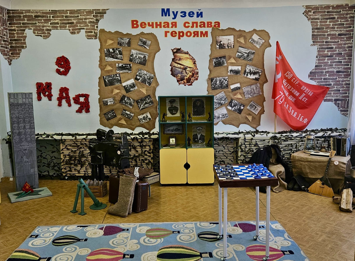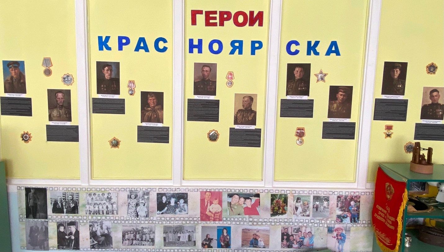 Создан музей боевой и трудовой славы «Красноярцы в годы Великой Отечественной войны» - как центр патриотического воспитания детей старшего дошкольного возраста. Дополнительно представлены для самостоятельного использования альбомы с фотографиями о Великой Отечественной войне, дидактические игры: «Я в городе», «Морской бой» - шашки, «Одень воина», «Четыре стихии», макеты сражений, локации к сюжетно-ролевым играм «В землянке», «Госпиталь», игровой макет «На поле сражения». Материалы доступны детям, чтобы можно их рассмотреть, держа в руках, использовать в беседах, в различных видах детской деятельности ситуативно.