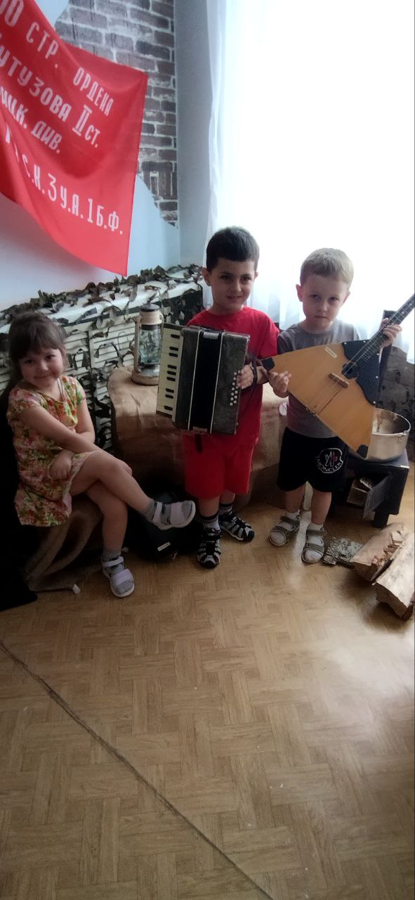 Оформлен музей в отдельном помещении - использована свободная группа из-за недокомплекта детей в ДОУ. По стенам оформлены стенды, плакаты : "Родина мать зовет", "Герои красноярцы", "Труженики тыла" и др. В шкафах размещены автобиографические материалы, награды и экспонаты участников боевых действий - родственников воспитанников ДОУ. - Оборудованы инсталляции, которые побуждают детей к сюжетно-ролевым играм: "На привале", "В землянке", "Полевой госпиталь", "Демобилизация на фронт", "Эвакуация в тыл", "Цех изготовления снарядов". - Изготовлены макеты совместно с детьми и родителями для игр «Боевое сражение», «Взятие высоты» и др. Манекены с образцами военной одежды. Уголок современности рассказывает об участниках боевых действий СВО родителей воспитанников. Все материалы доступны детям, чтобы можно их рассмотреть, держа в руках, использовать в беседах, в различных видах детской деятельности ситуативно. |