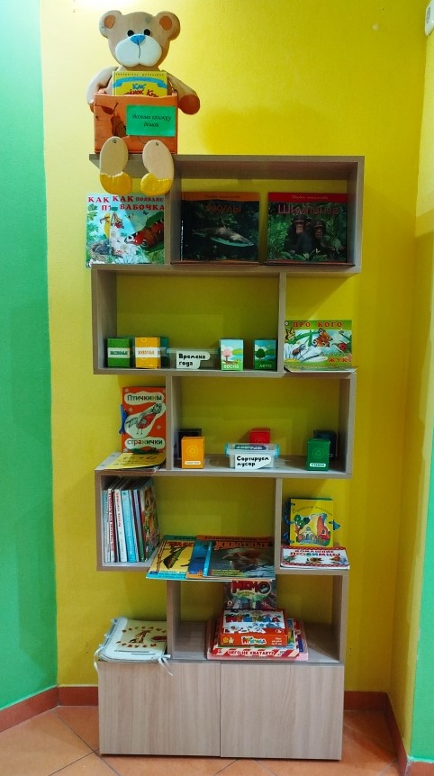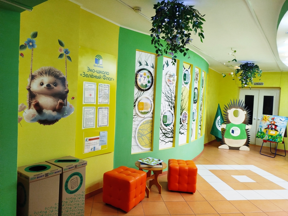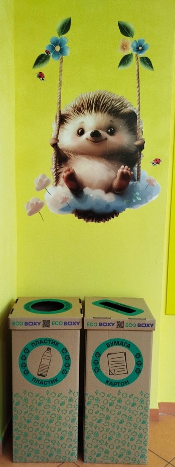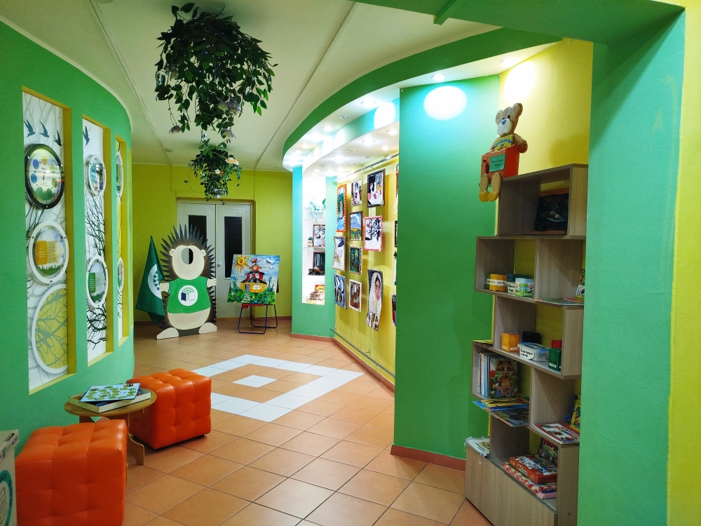Пространство холла представлено рекреацией 18 кв.м. с зонированием: информационная зона (информация об экологическом направлении, реализуемом в ДОУ, положение об Экологическом совете ДОУ, состав на текущий год, план мероприятий, утвержденный Экологическим советом ДОУ, информация о текущих акциях и проектах, Экокодексы ДОУ), зона рационального управления отходами (контейнеры для сбора пластиковых крышек и макулатуры), зона «Буккроссинг», зона «Галерея» (семейные и детские работы из бросовых материалов), зона «Настолка» (игры из бросового материалы), зона отдыха и приятных встреч.
