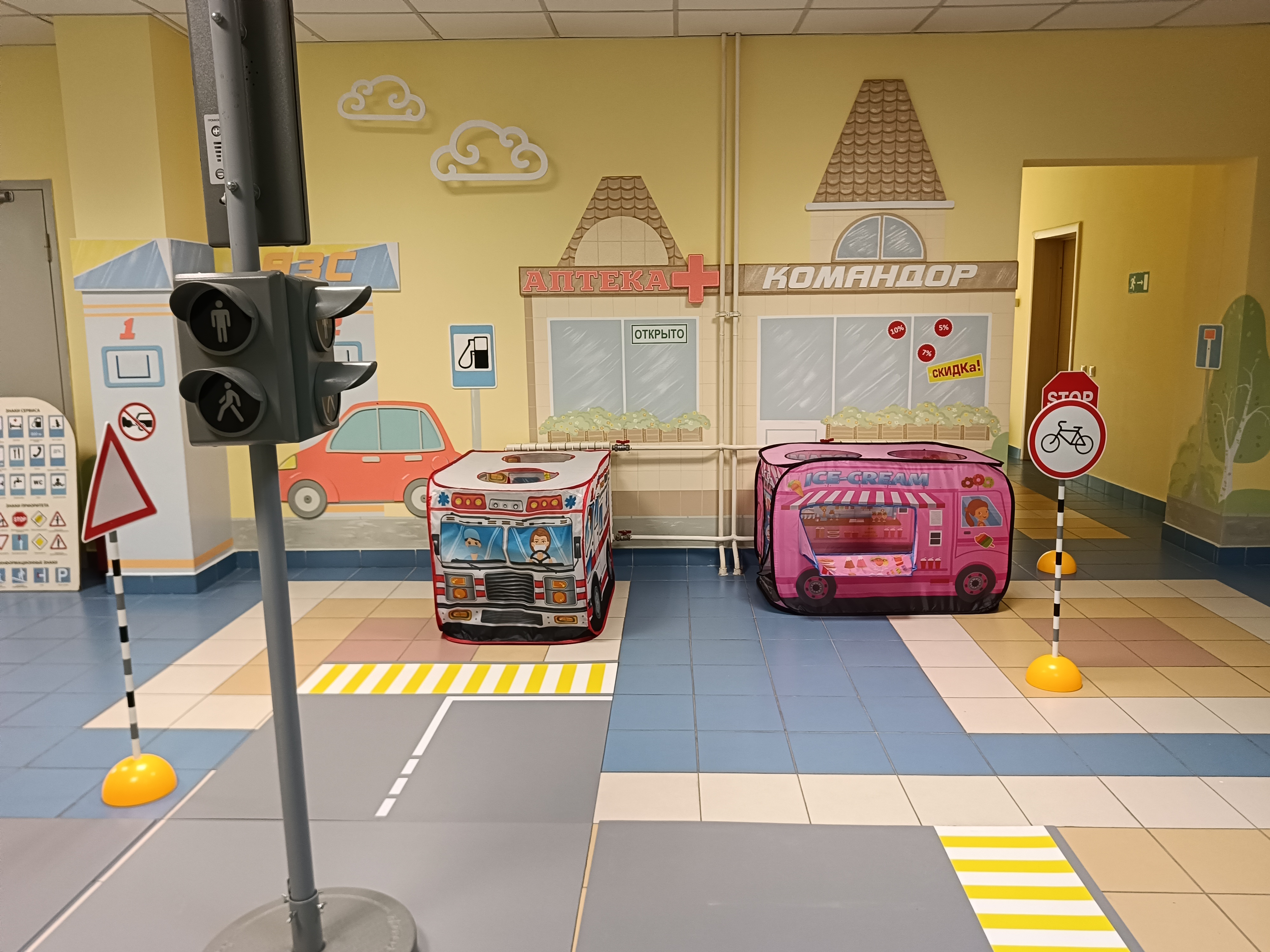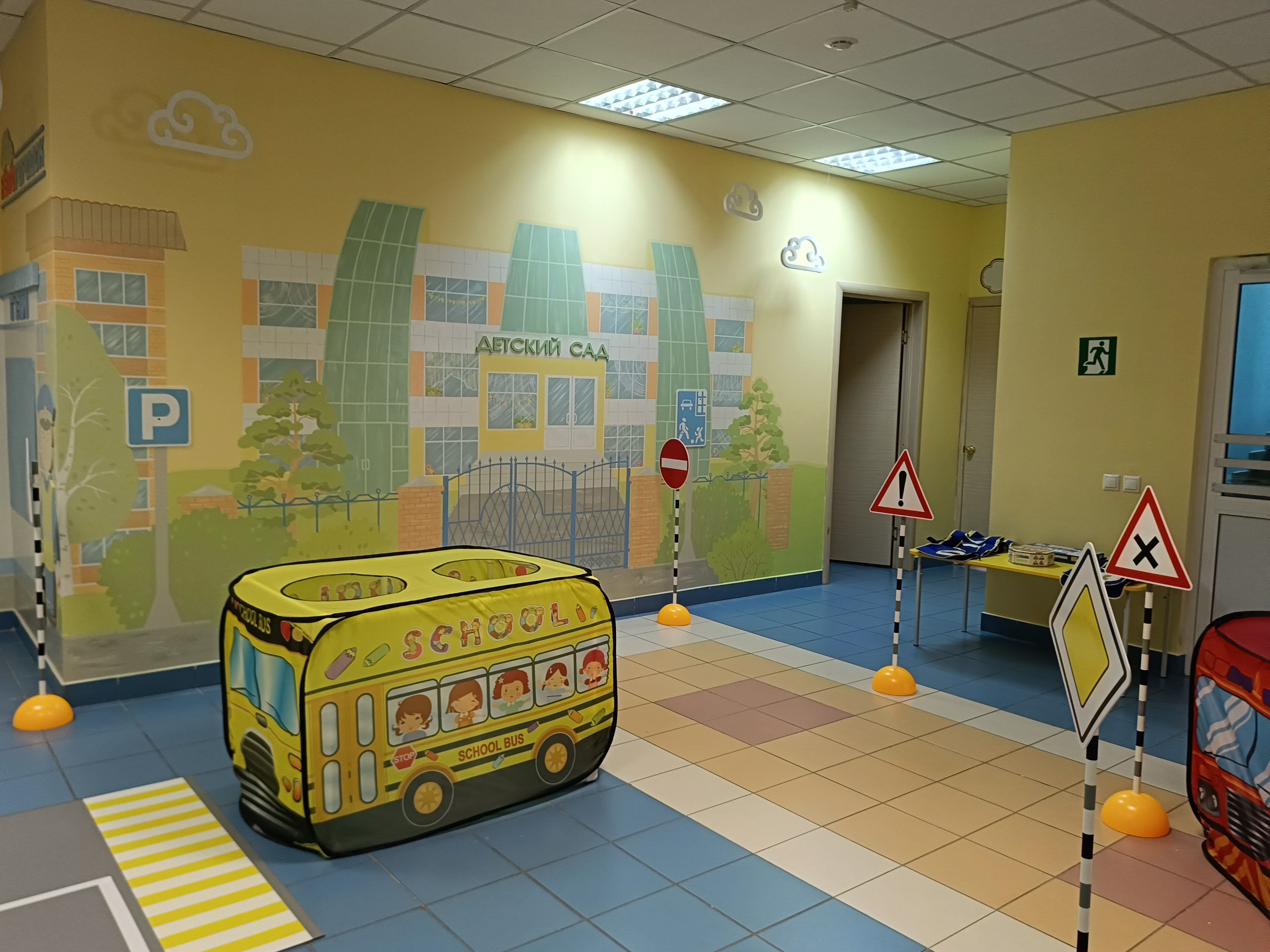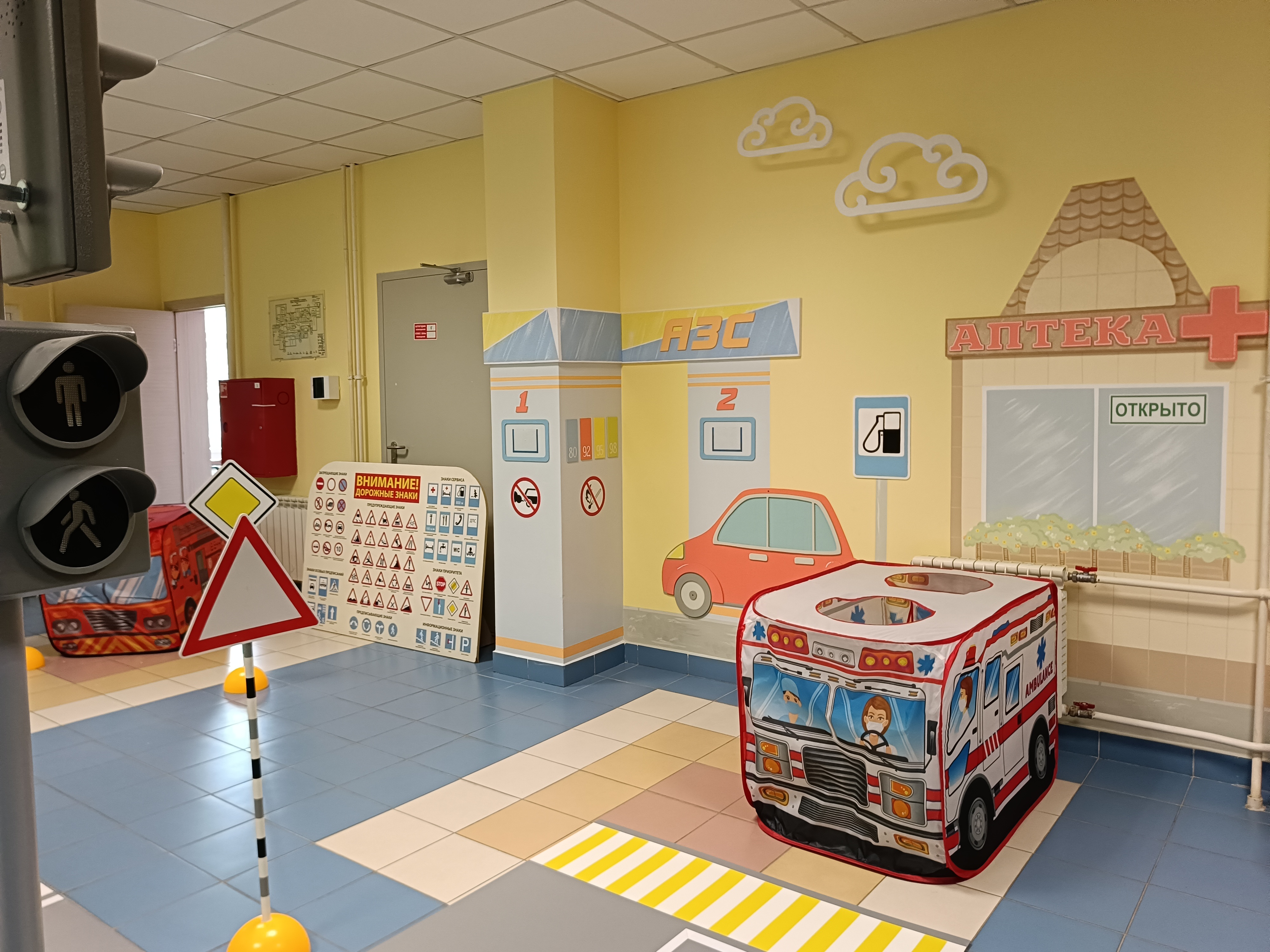 - Игровая площадка в холле на первом этаже, это оборудованный центр для моделирования ситуаций на дорогах, включающая разметку пешеходных переходов, дорожные знаки, светофоры, имитированные транспортные средства, также в ДОУ имеется мобильный Автогородок. Границы центра открыты, что делает его доступным и безопасным для детей.