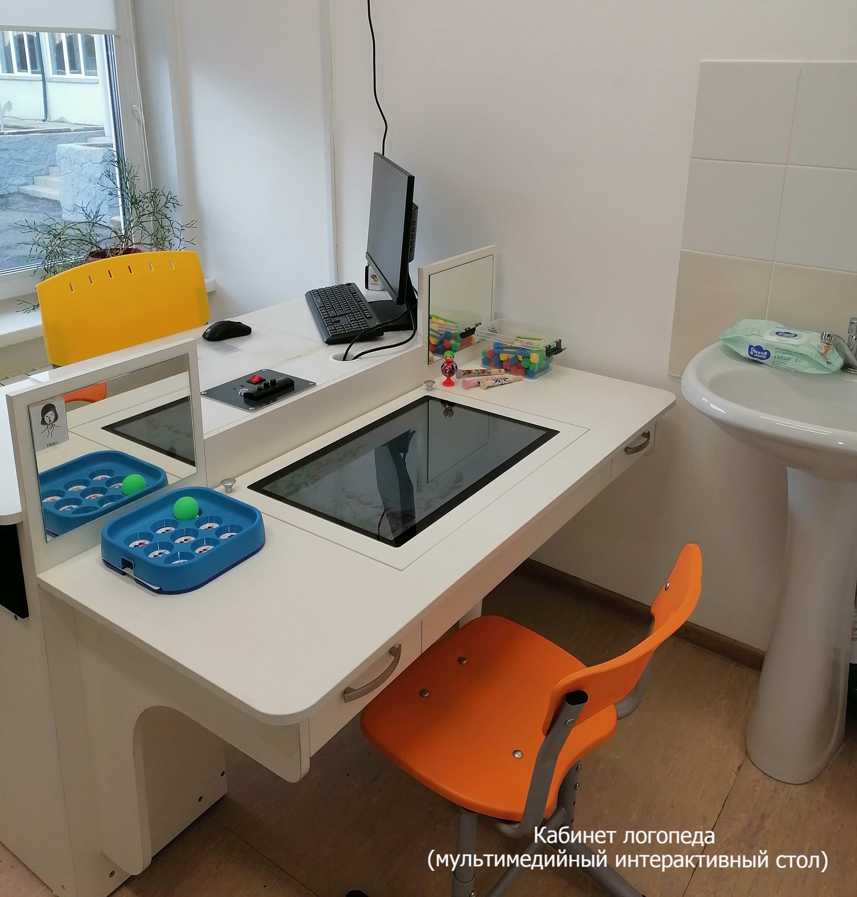Важнейшее место занимает интерактивный стол, оснащённый программным обеспечением, направленным на коррекцию речевого аппарата, автоматизацию звуков, развитие фонетико-фонематического слуха и лексико-грамматического строя речи. Эти программы поддерживают активное участие ребёнка в обучении, делают занятия интересными и эффективны для закрепления результатов коррекционной работы.