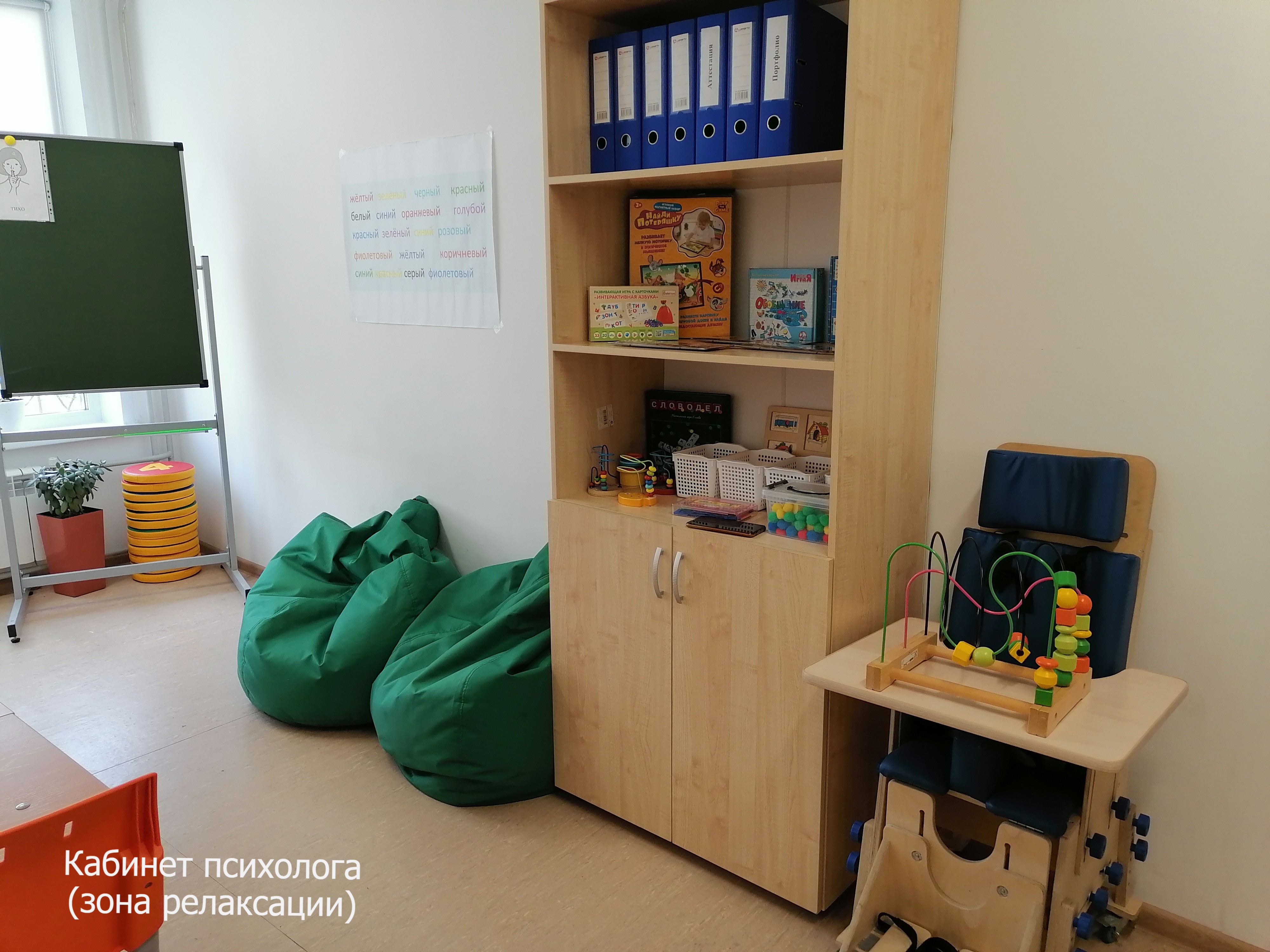 В кабинете оборудованы места для отдыха и релаксации обучающихся: предусмотрены мягкие кресла-мешки, аудиовизуальное оборудование с функцией светомузыки, утяжелённое одеяло для аутичных детей модели «Сова», а также специальное кресло-«яйцо».
