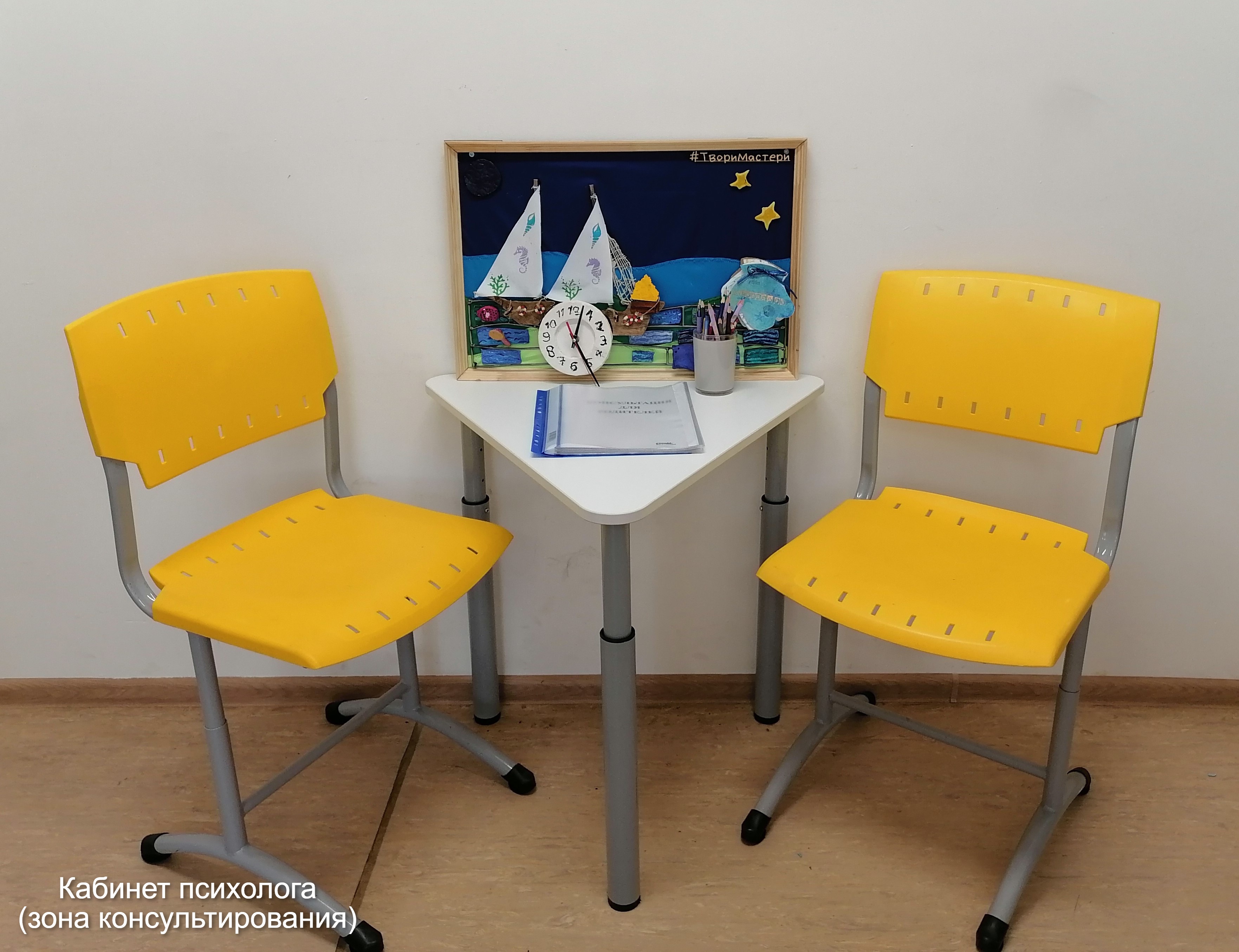 Кабинет педагога-психолога разделён на три функциональных зоны: рабочую зону педагога, зону для проведения коррекционно-развивающих занятий и диагностических мероприятий, а также отдельную зону для консультаций и бесед с родителями и педагогами.