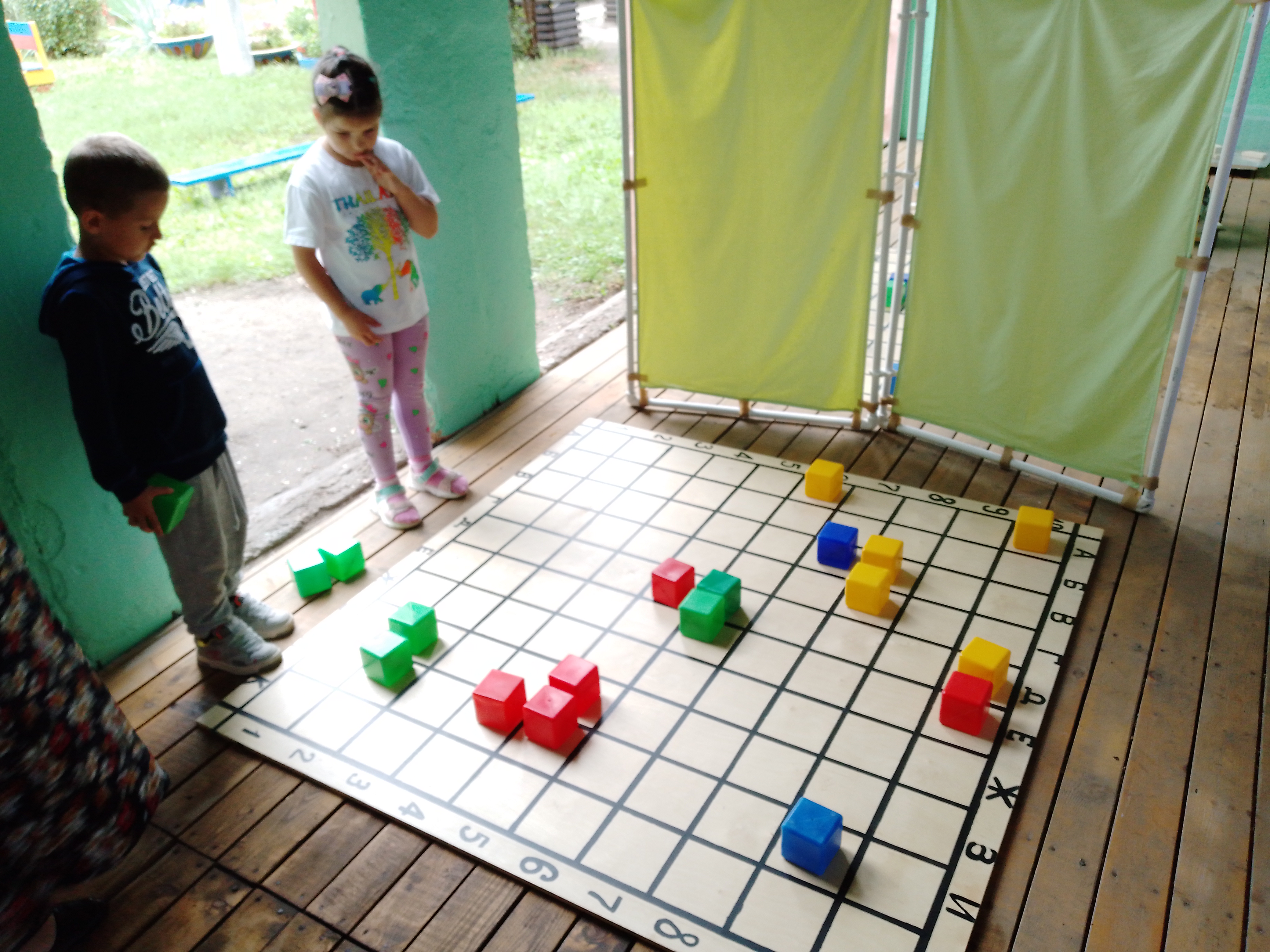 - Двигательной (нахождение на свежем воздухе обеспечивает удовлетворение естественное потребности ребёнка в движении, развитии двигательных навыков и умений, удобство размещения локаций позволяет каждому ребёнку дозировать двигательную активность по собственному самочувствию, конструктивная деятельность развивает зрительно-моторную координацию, игры с «Умными координатами» способствуют развитию ориентировке в пространстве, на плоскости листа).