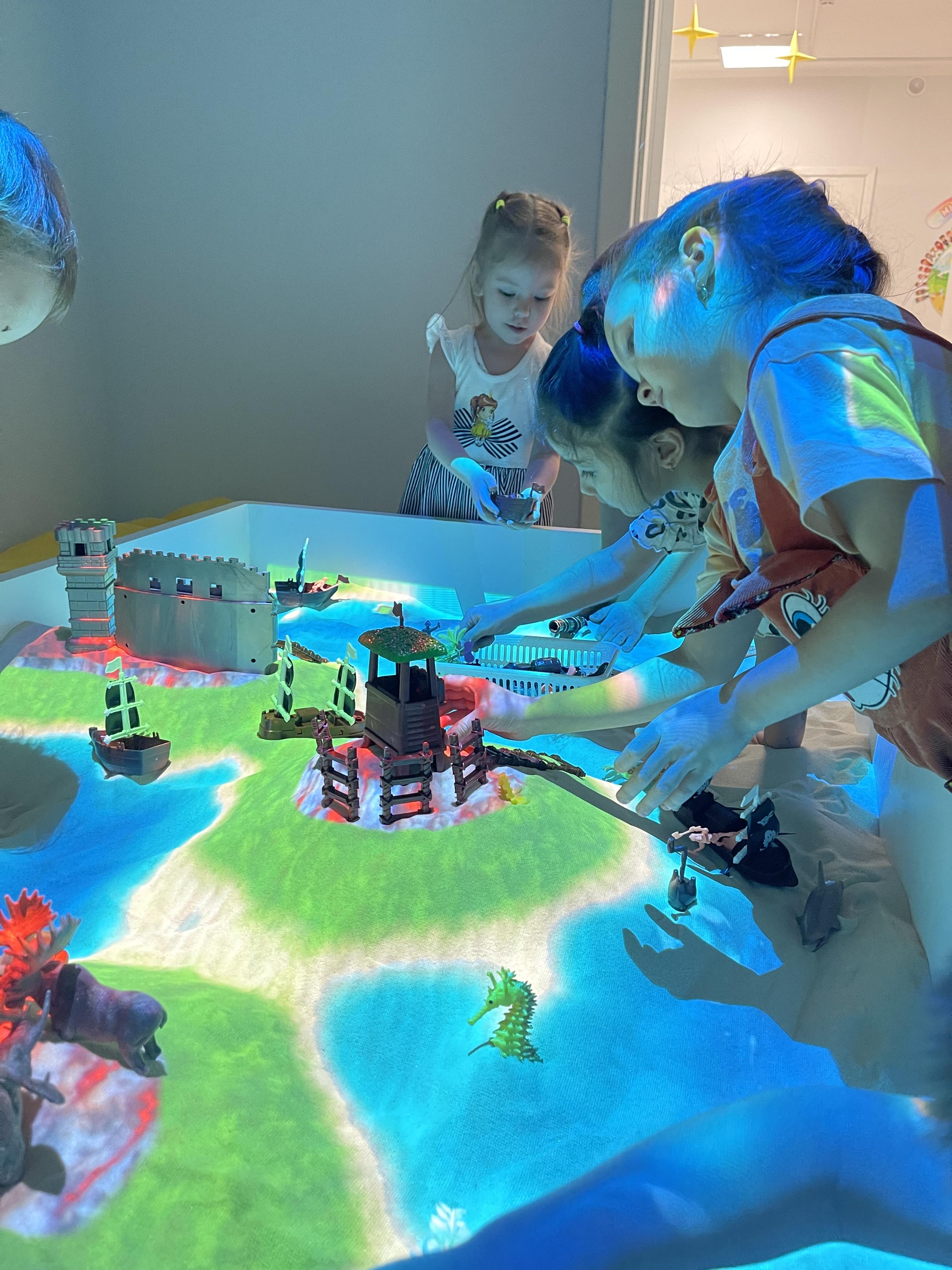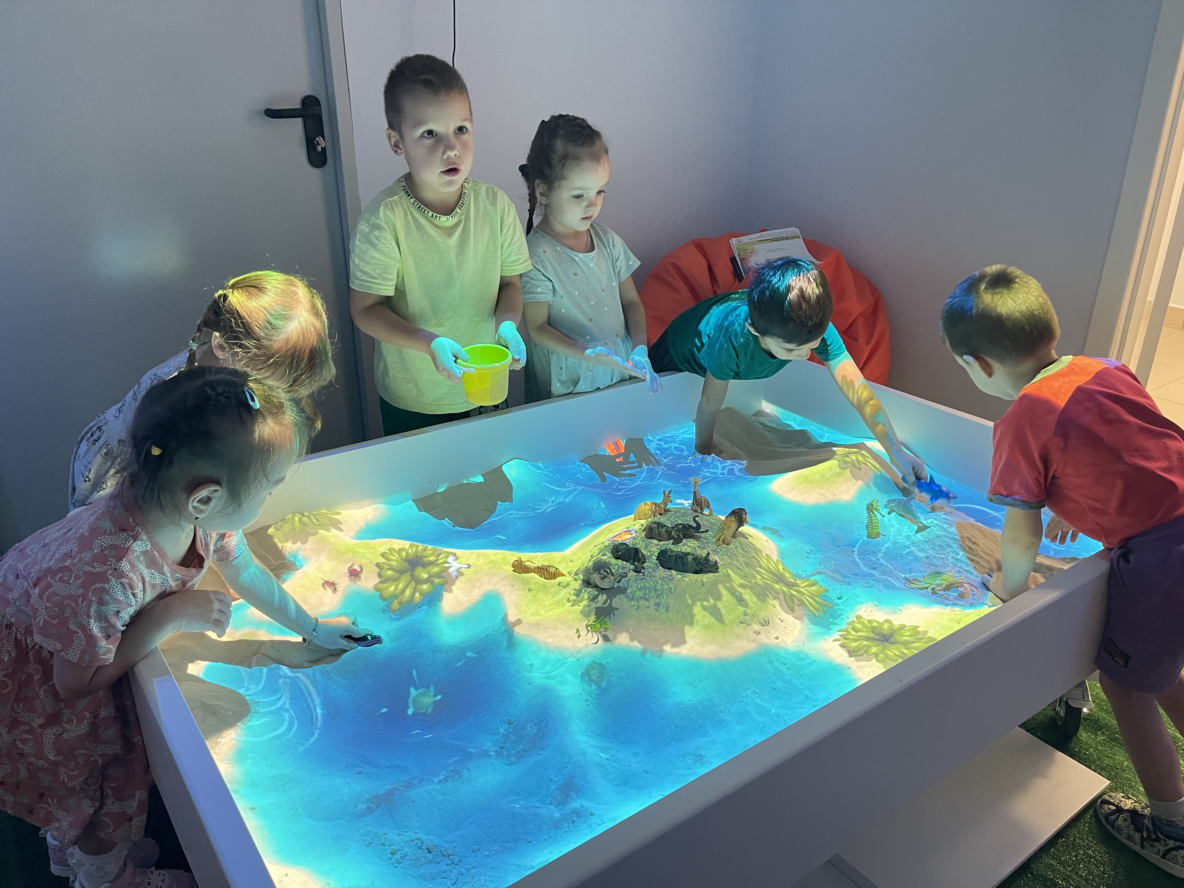 - ИНТЕРАКТИВНАЯ ПЕСОЧНИЦА – ЭТО УНИКАЛЬНОЕ ИЗОБРЕТЕНИЕ – на песочное поле проецируются «живые» сюжетные картины, с которыми дети могут взаимодействовать. Работа построена на технологиях дополненной реальности, благодаря чему обычный песок превращается в волшебную вселенную. Перед детьми открываются живописные пейзажи, которые он может перекроить в одно мгновение: выкопать озеро, построить вулкан или даже целый замок. Интерактивная песочница является маленькой моделью окружающего мира.