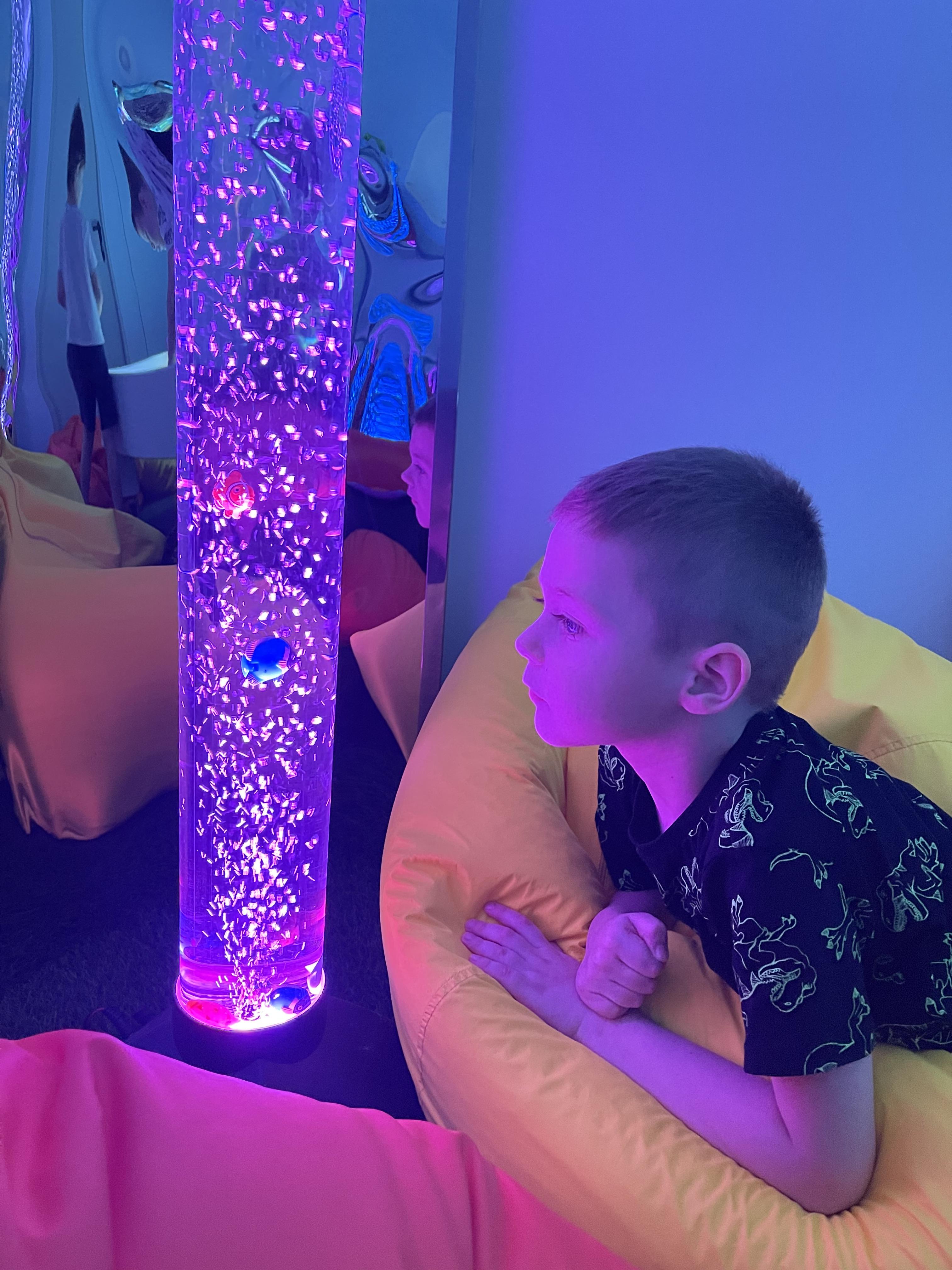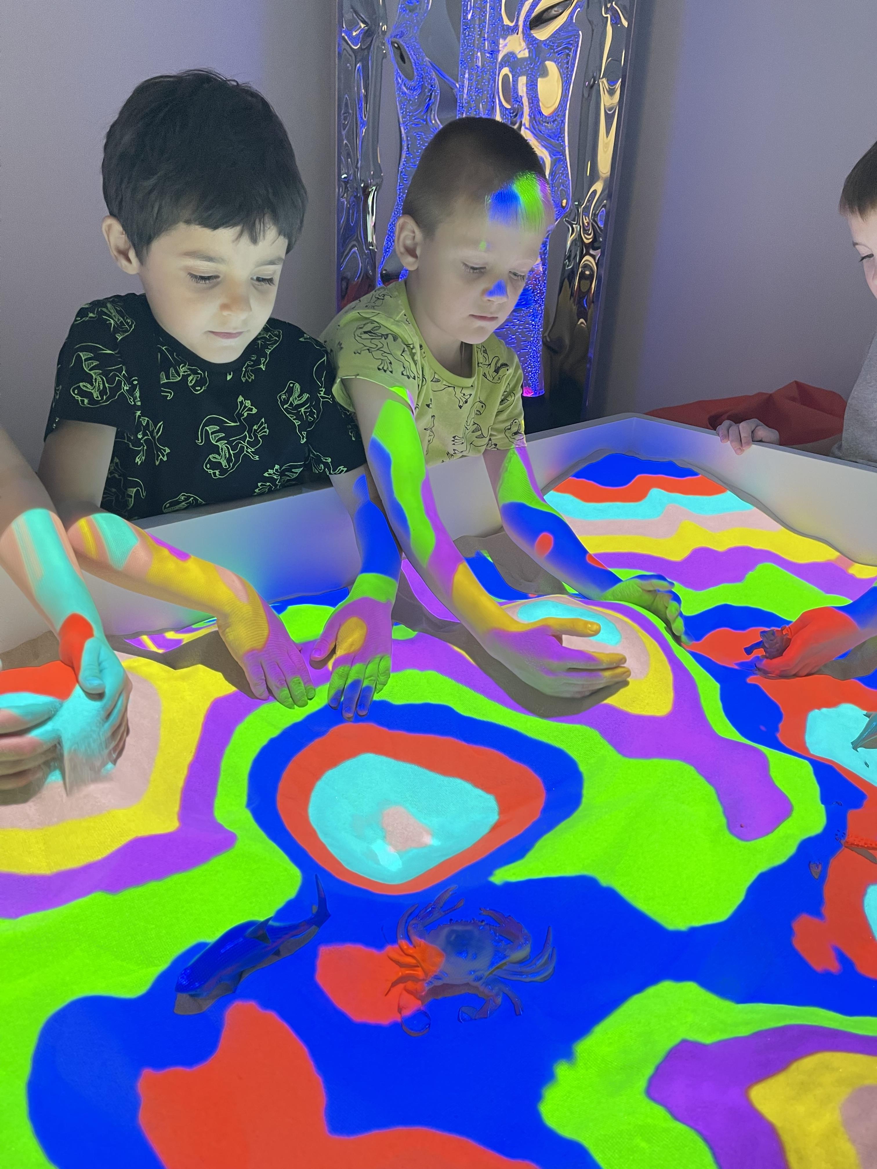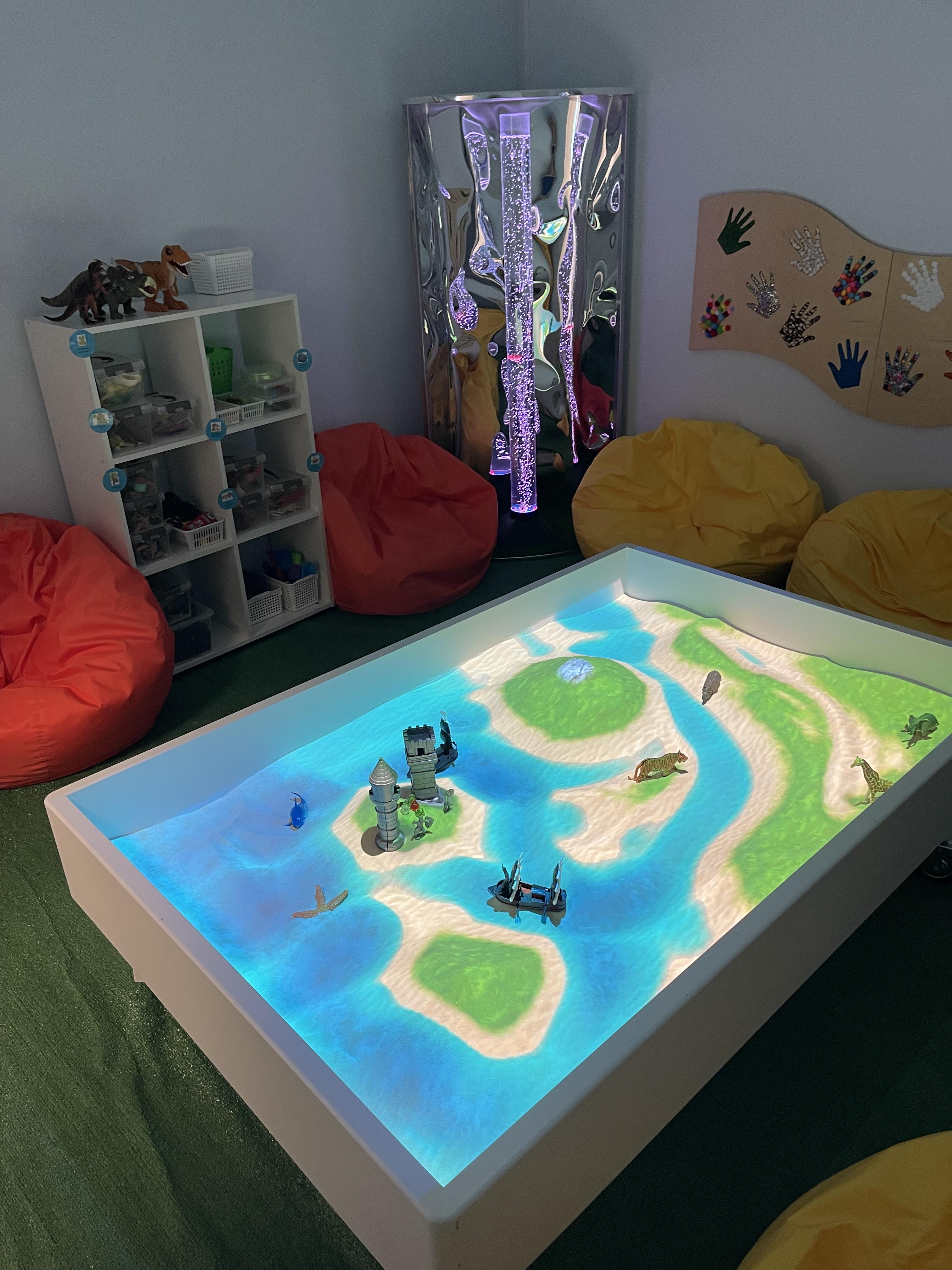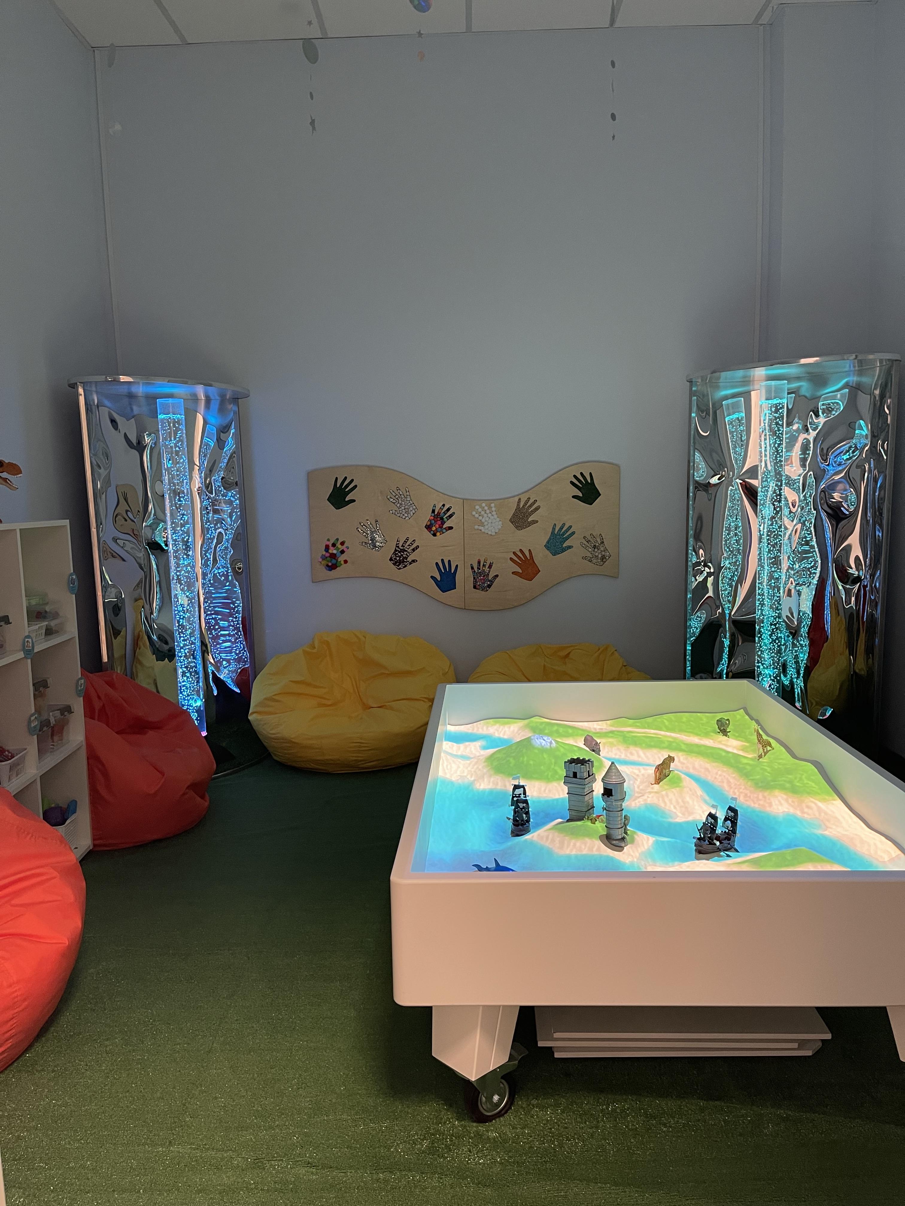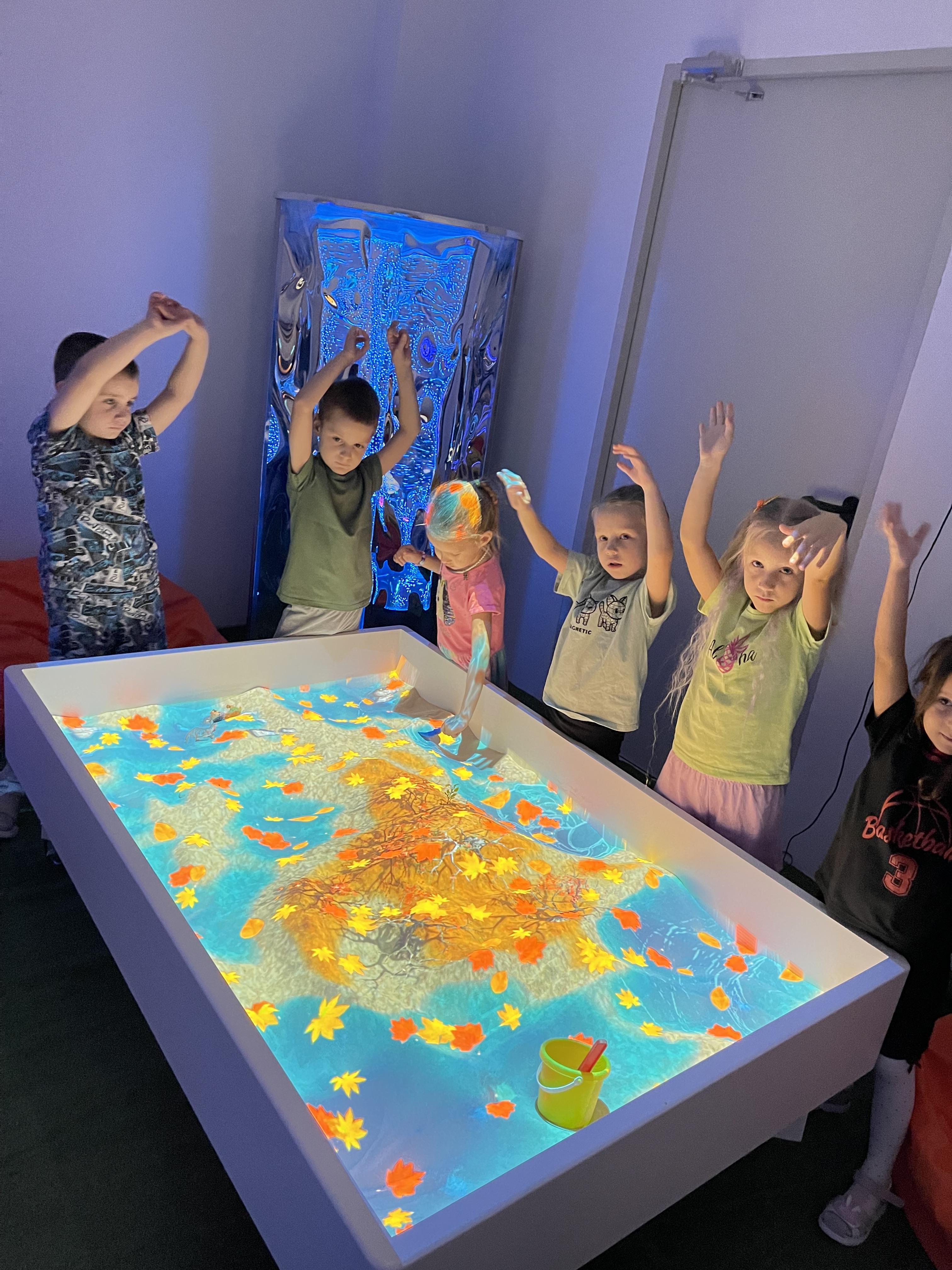 Занятия проводятся за закрытой дверью, освещение происходит за счет пузырьковых колонн и интерактивной песочницы, что делает Сенсорную комнату загадочной и волшебной. Такое пространство привлекает и расслабляет даже самых тревожных детей.