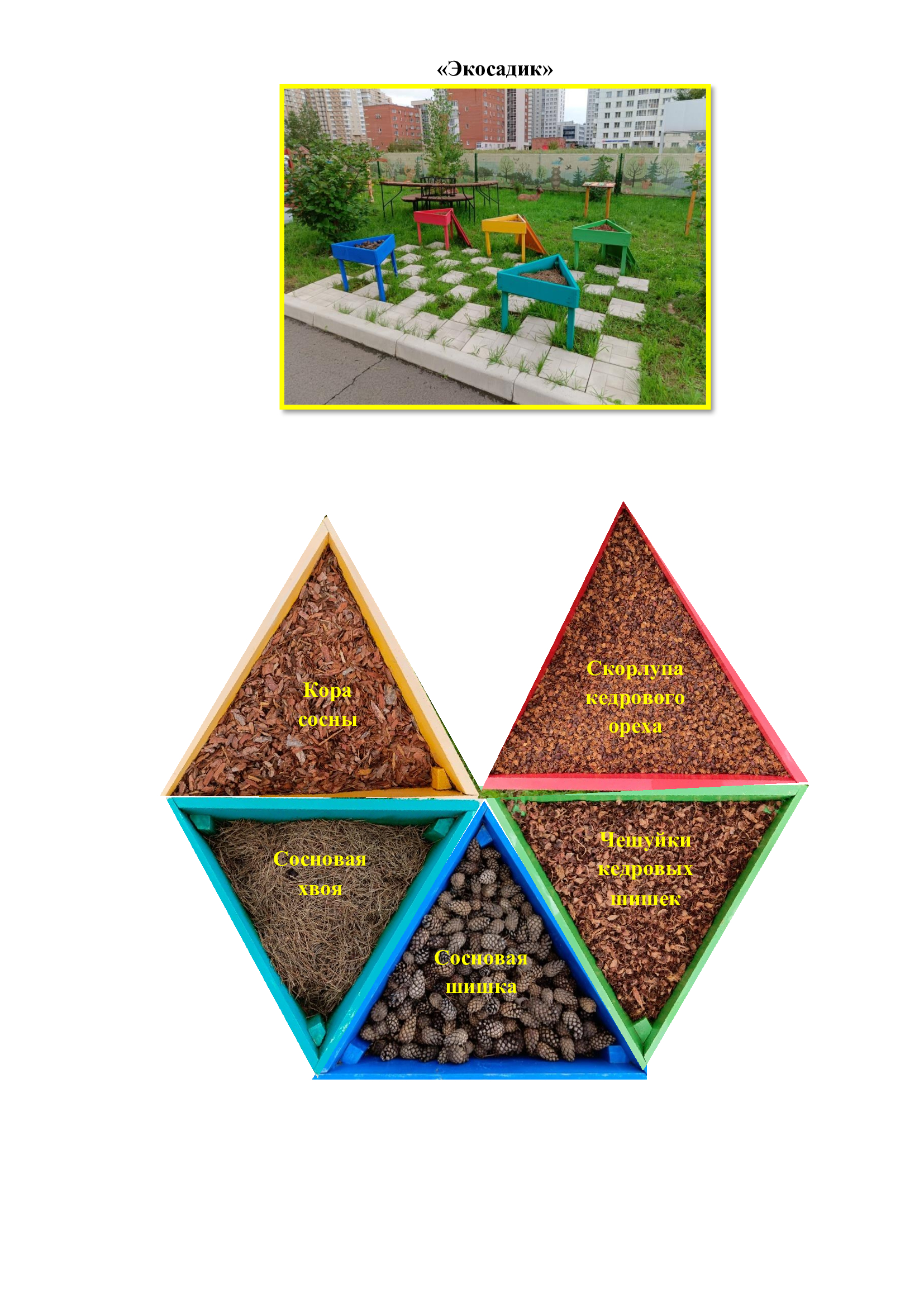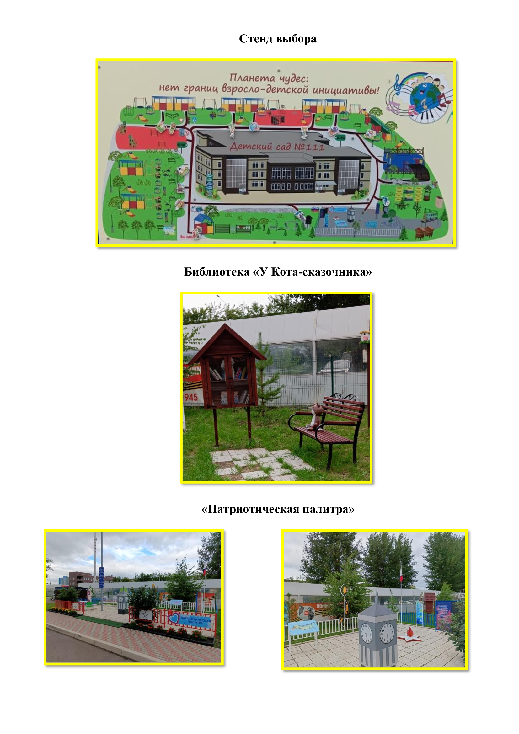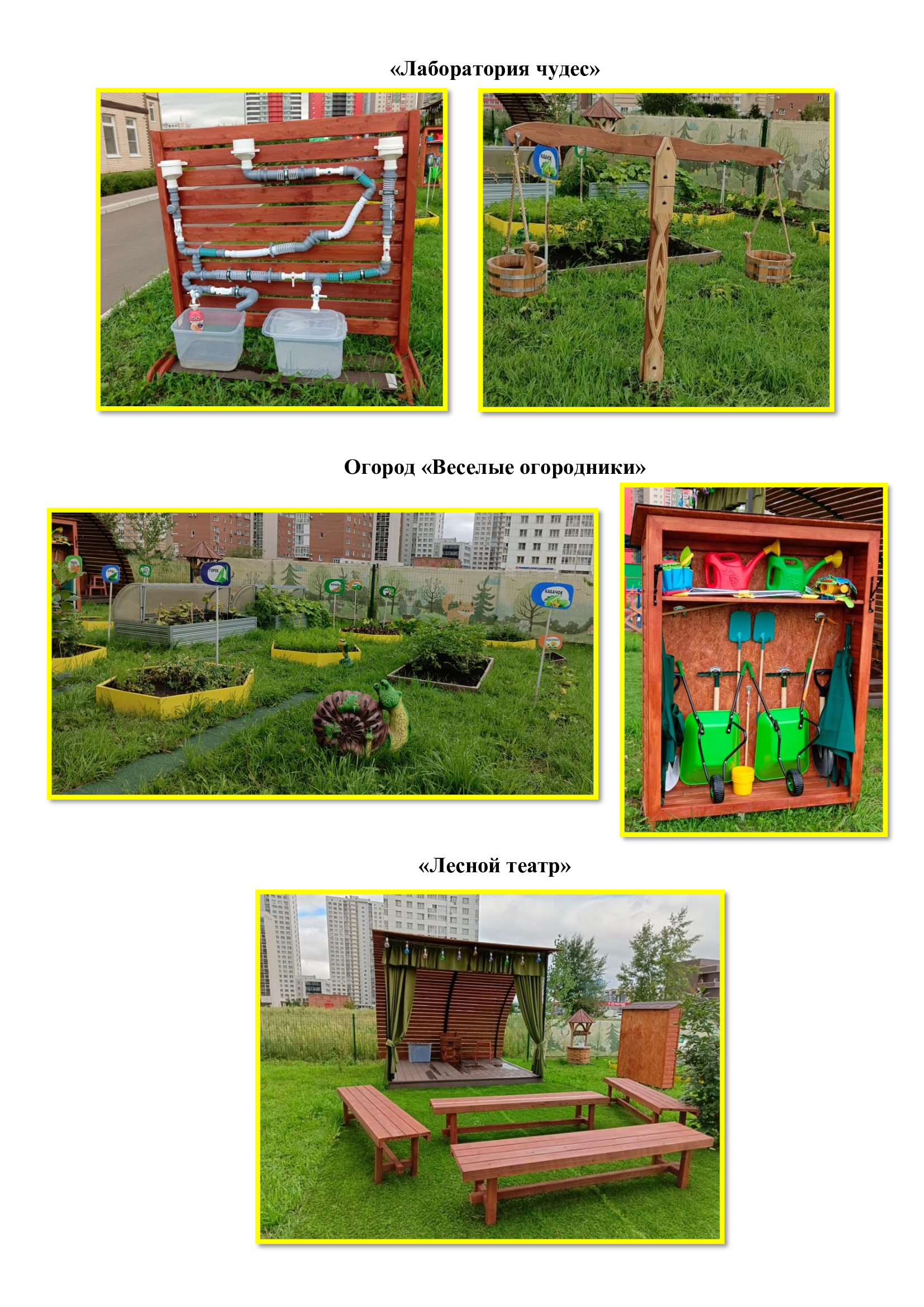 Организовано 11 тематических центров активности вокруг здания детского сада: библиотека «У Кота-сказочника», «Патриотическая палитра», «Пасека», «Птичья столовая», «Экосадик», «Лаборатория чудес», огород "Веселые огородники", «Лесной театр», «Музыкальная поляна», «Спортландия» и «Городок дорожной безопасности».