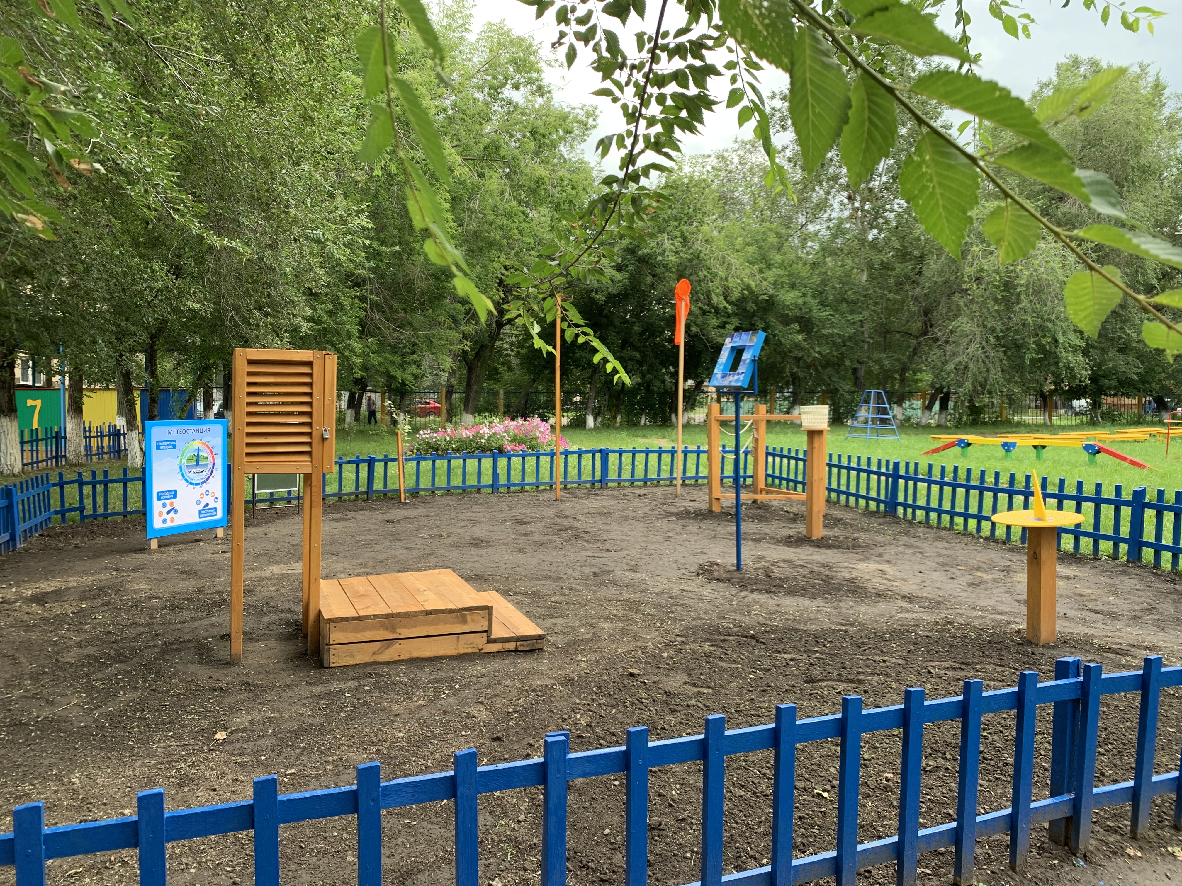- метеоплощадка (барометр, термометр, ловец облаков, солнечные часы, измеритель осадков, флюгер)