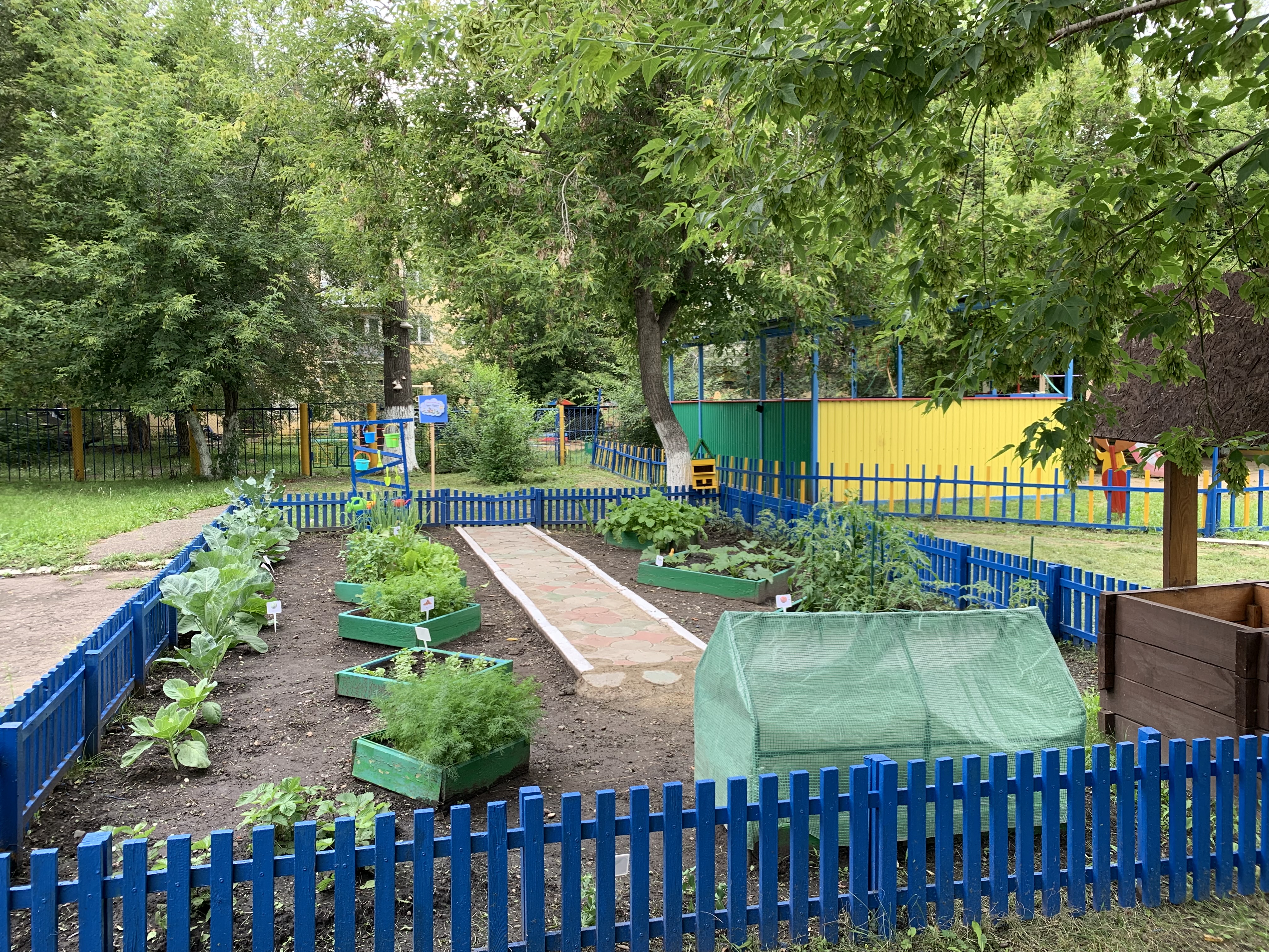 - экологическая площадка «Наш веселый огород» (детские садово-огородные инструменты, грядки с овощными культурами, мини-теплица, колодец и др.)