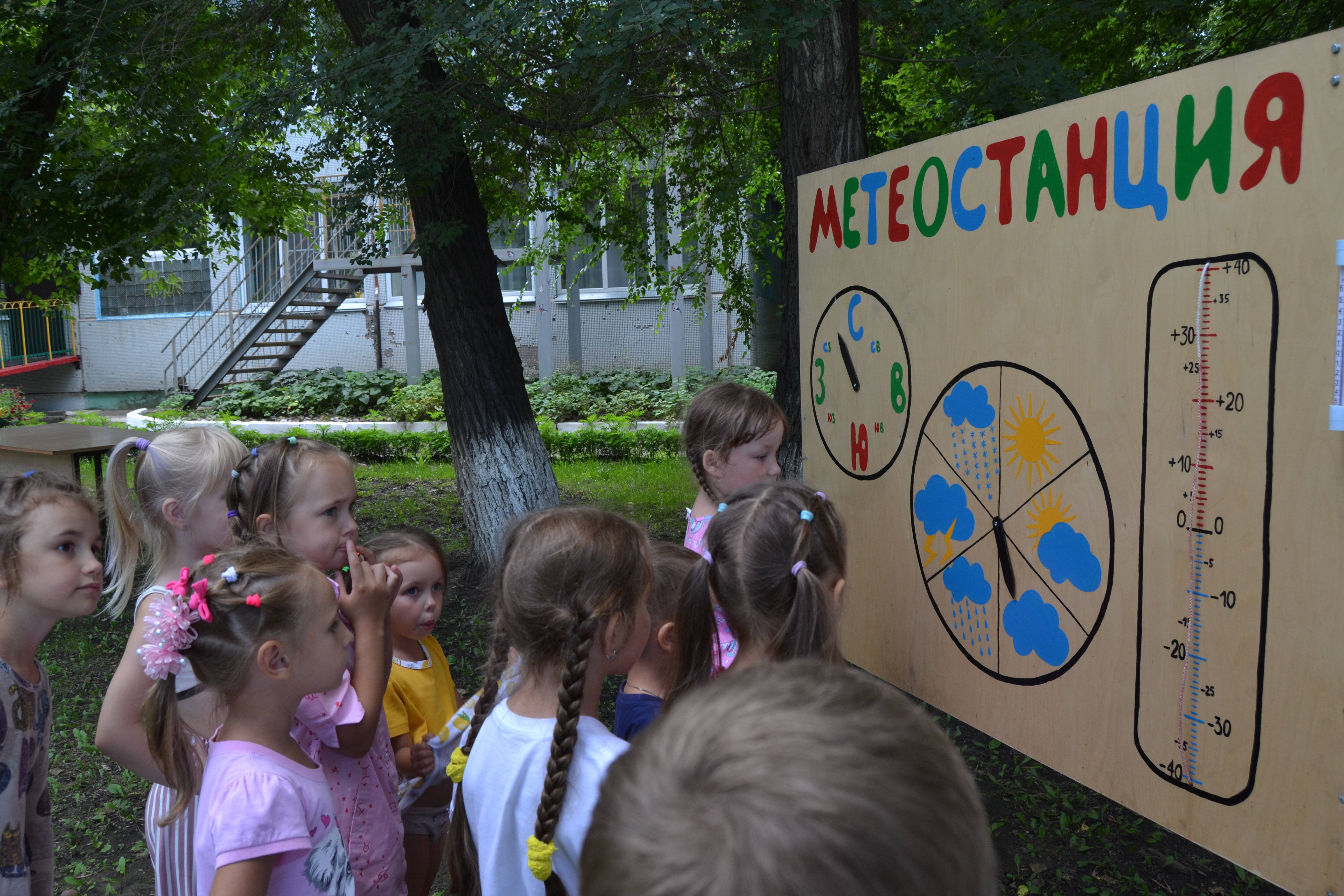 3. «Метеостанция», центр наблюдения и фиксирования природных явлений и состояния погоды (стенд с термометром, флюгером, барометром, дождемером и схемой рассказа с обратной стороны (для детей младшего возраста и детей с ОВЗ));