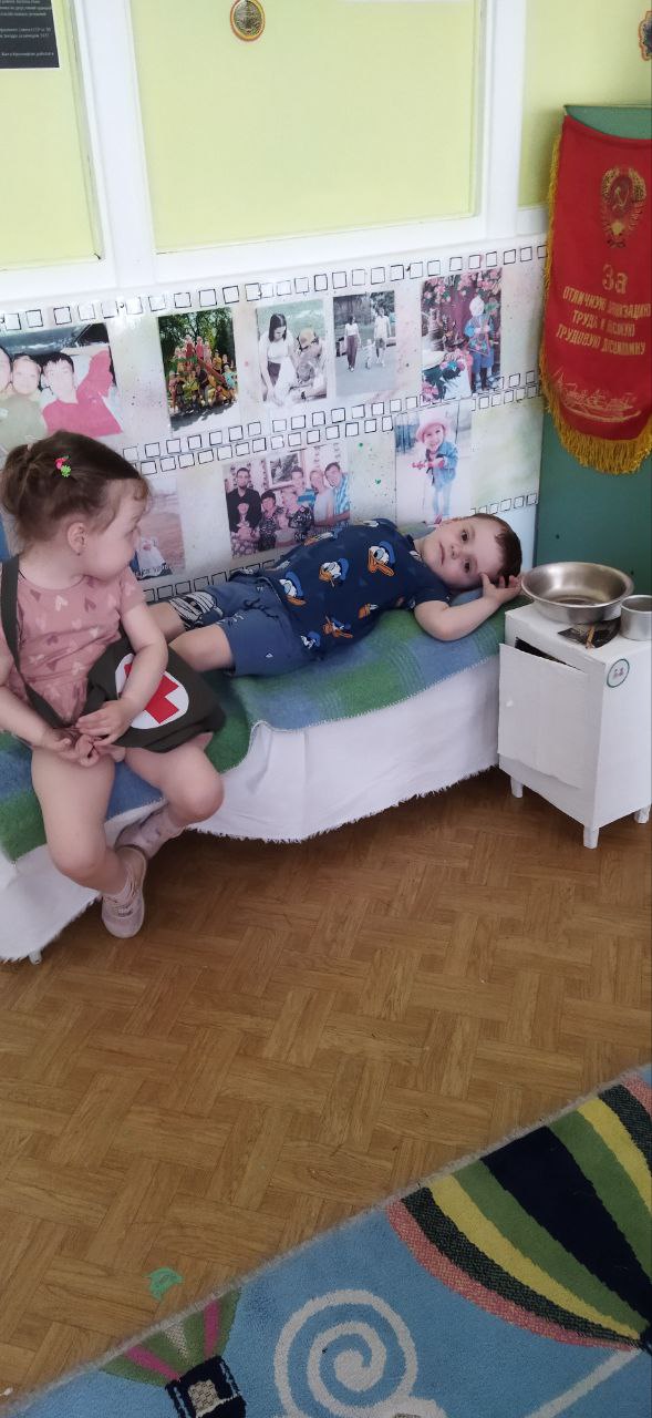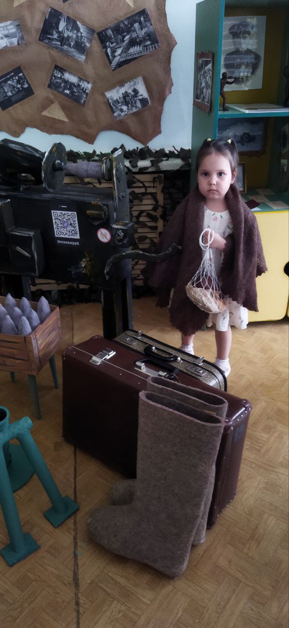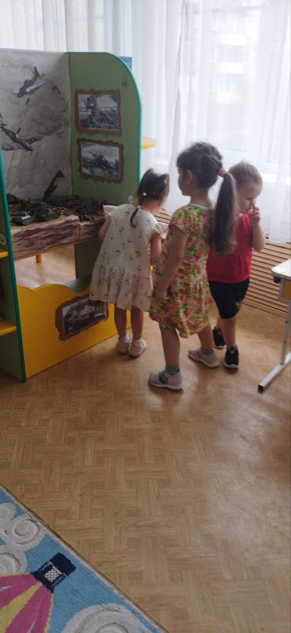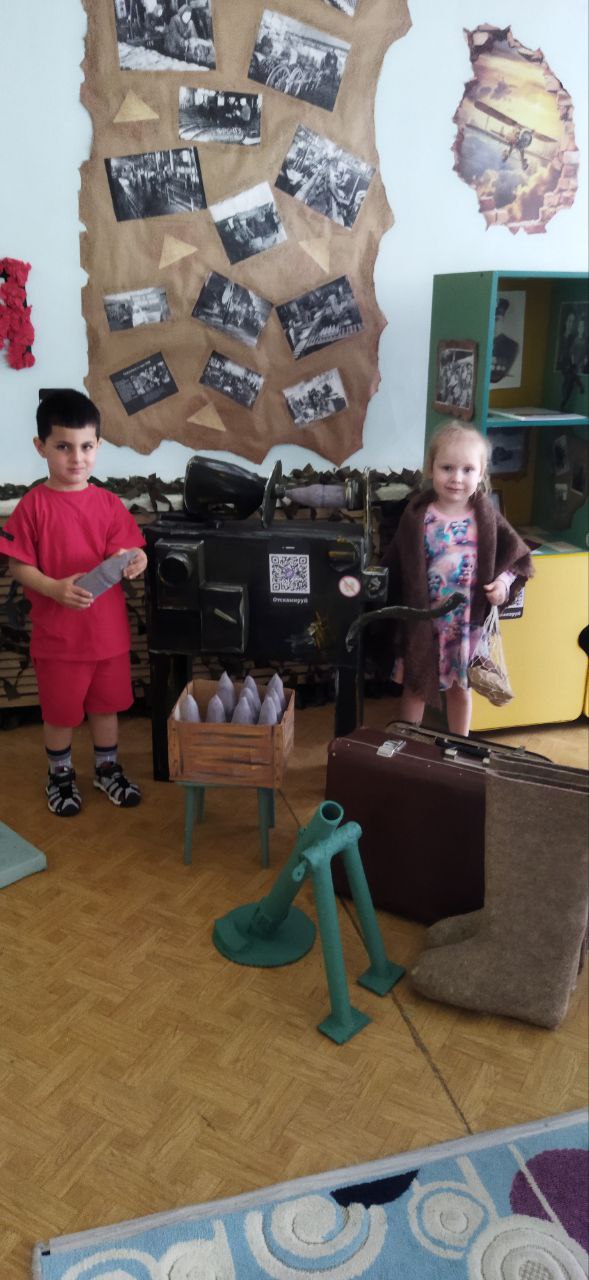 Оформлен музей в отдельном помещении - использована свободная группа из-за недокомплекта детей в ДОУ. По стенам оформлены стенды, плакаты : "Родина мать зовет", "Герои красноярцы", "Труженики тыла" и др. В шкафах размещены автобиографические материалы, награды и экспонаты участников боевых действий - родственников воспитанников ДОУ. - Оборудованы инсталляции, которые побуждают детей к сюжетно-ролевым играм: "На привале", "В землянке", "Полевой госпиталь", "Демобилизация на фронт", "Эвакуация в тыл", "Цех изготовления снарядов". - Изготовлены макеты совместно с детьми и родителями для игр «Боевое сражение», «Взятие высоты» и др. Манекены с образцами военной одежды. Уголок современности рассказывает об участниках боевых действий СВО родителей воспитанников. Все материалы доступны детям, чтобы можно их рассмотреть, держа в руках, использовать в беседах, в различных видах детской деятельности ситуативно. |