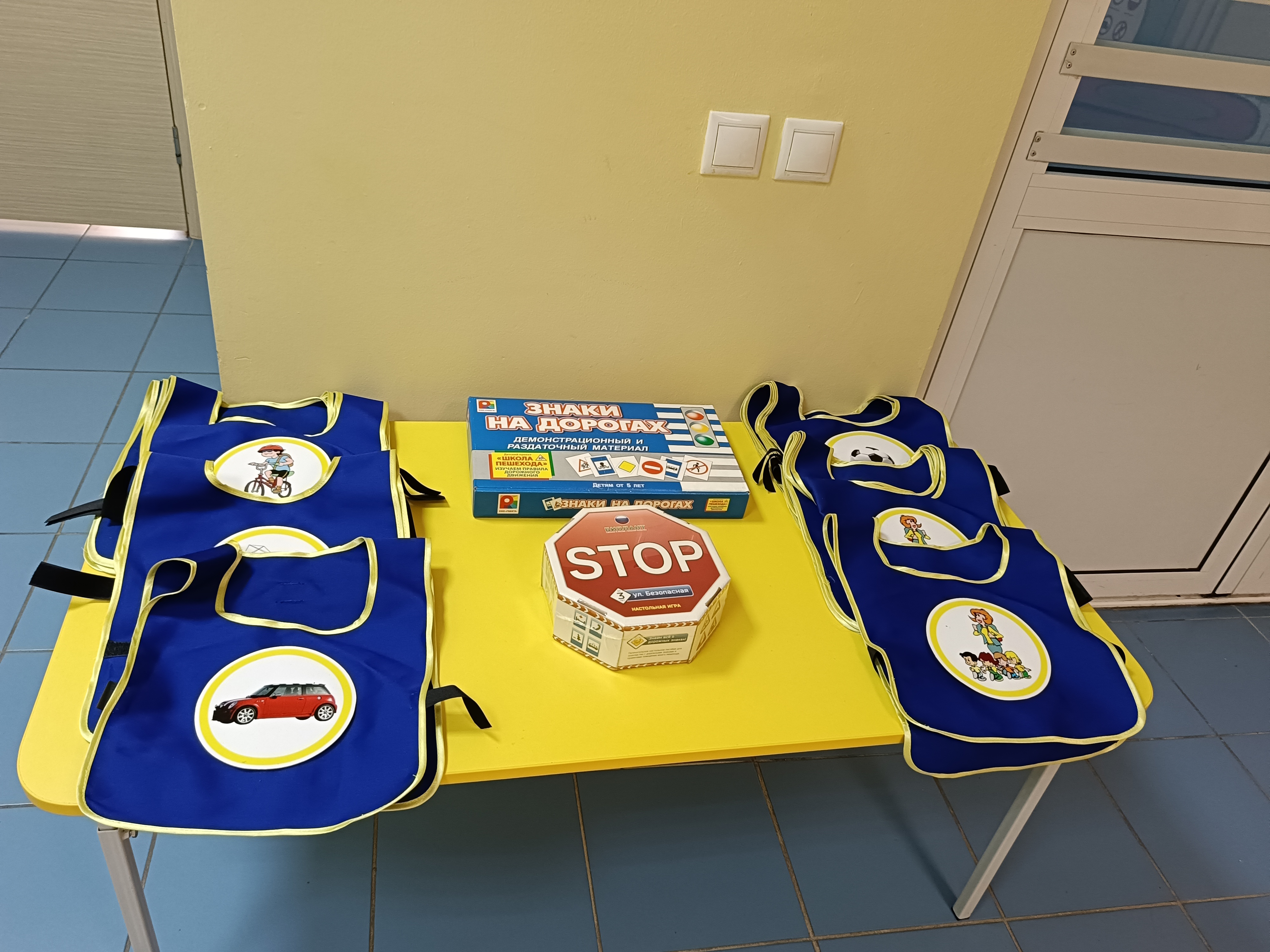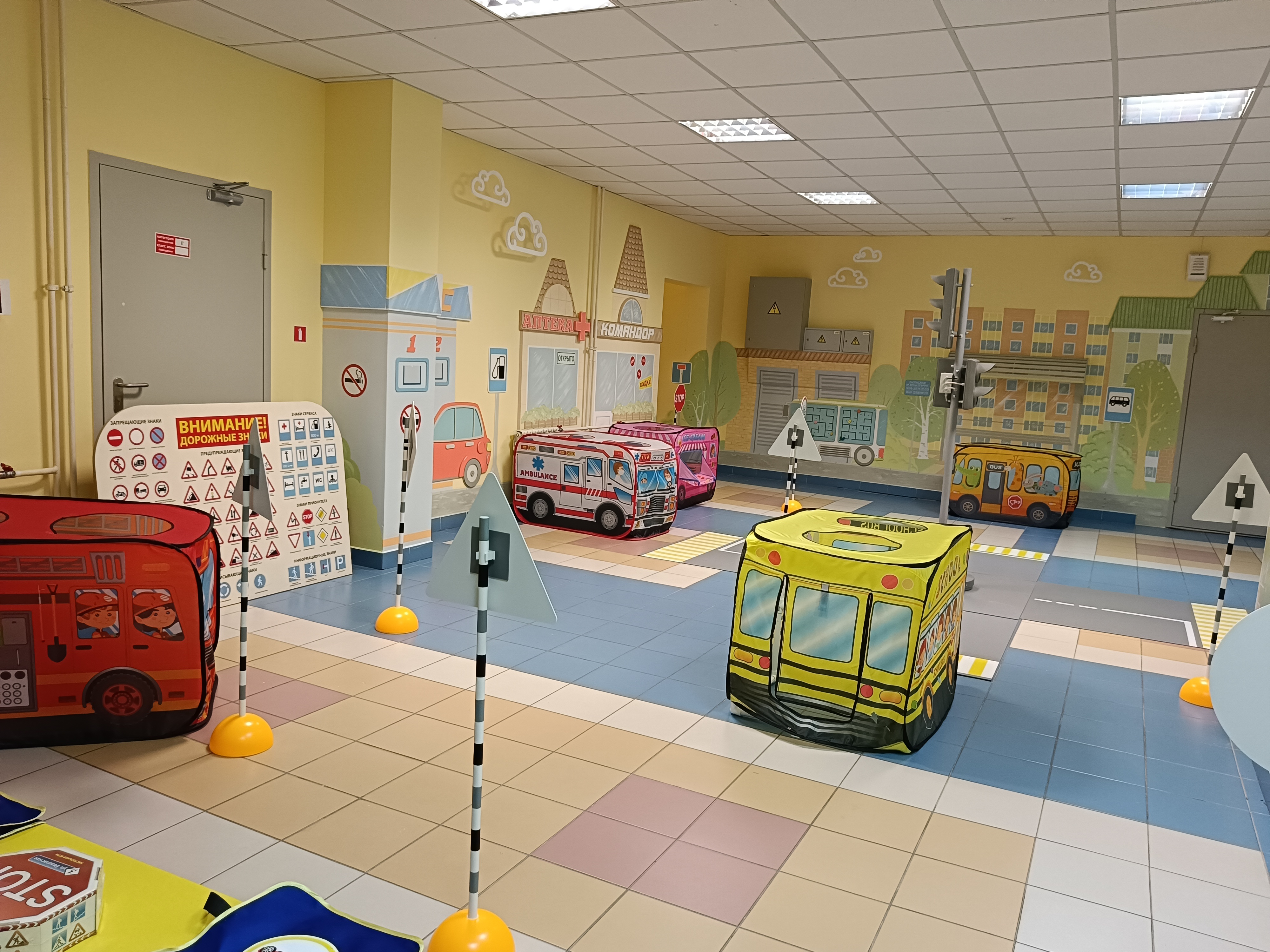 - Игровая площадка в холле на первом этаже, это оборудованный центр для моделирования ситуаций на дорогах, включающая разметку пешеходных переходов, дорожные знаки, светофоры, имитированные транспортные средства, также в ДОУ имеется мобильный Автогородок. Границы центра открыты, что делает его доступным и безопасным для детей.