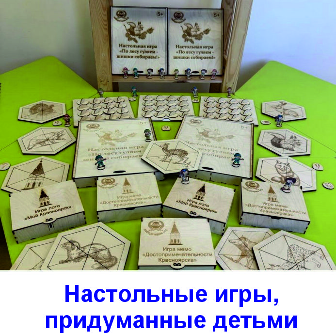создано 10 детских настольных игр («По лесу гуляем, шишки собираем», «Путешествие по Красноярску», Лото «Мой Красноярск», Мемо «Достопримечательности Красноярска», «Красноярские Столбы» и др)