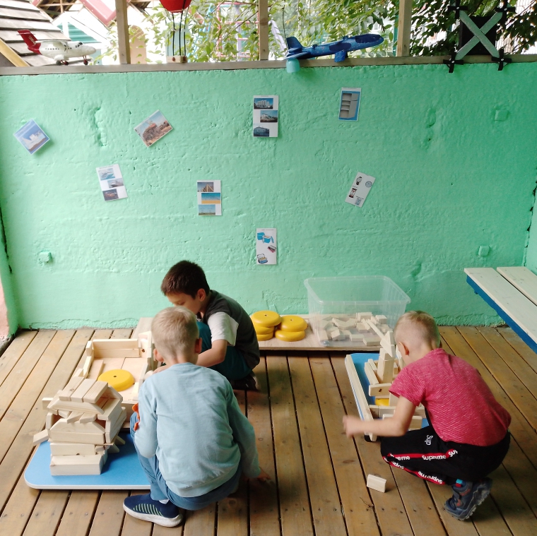 2. «Играй!», пространство для конструирования и игры с неоформленным материалом («Дачным конструктором», изготовленным самостоятельно из деревянных спилов от дачного строительства семей воспитанников);