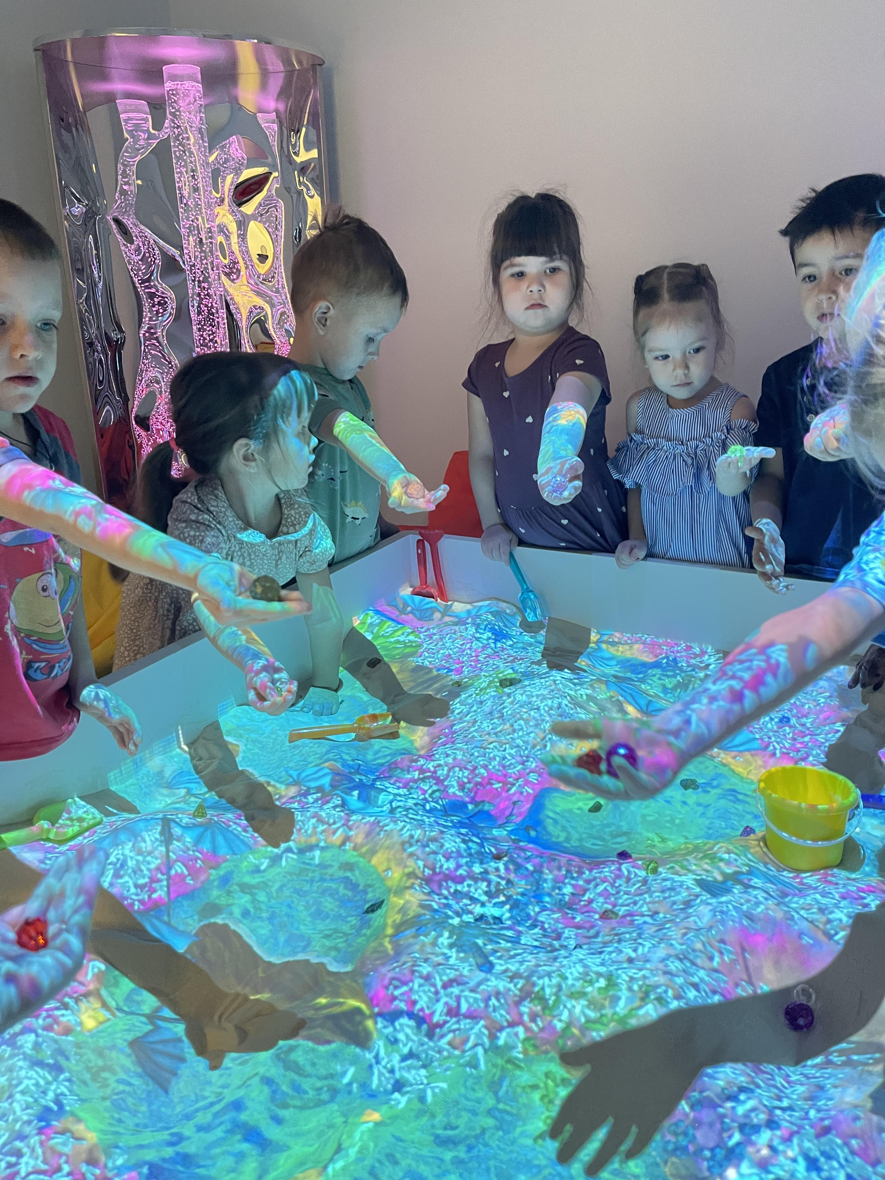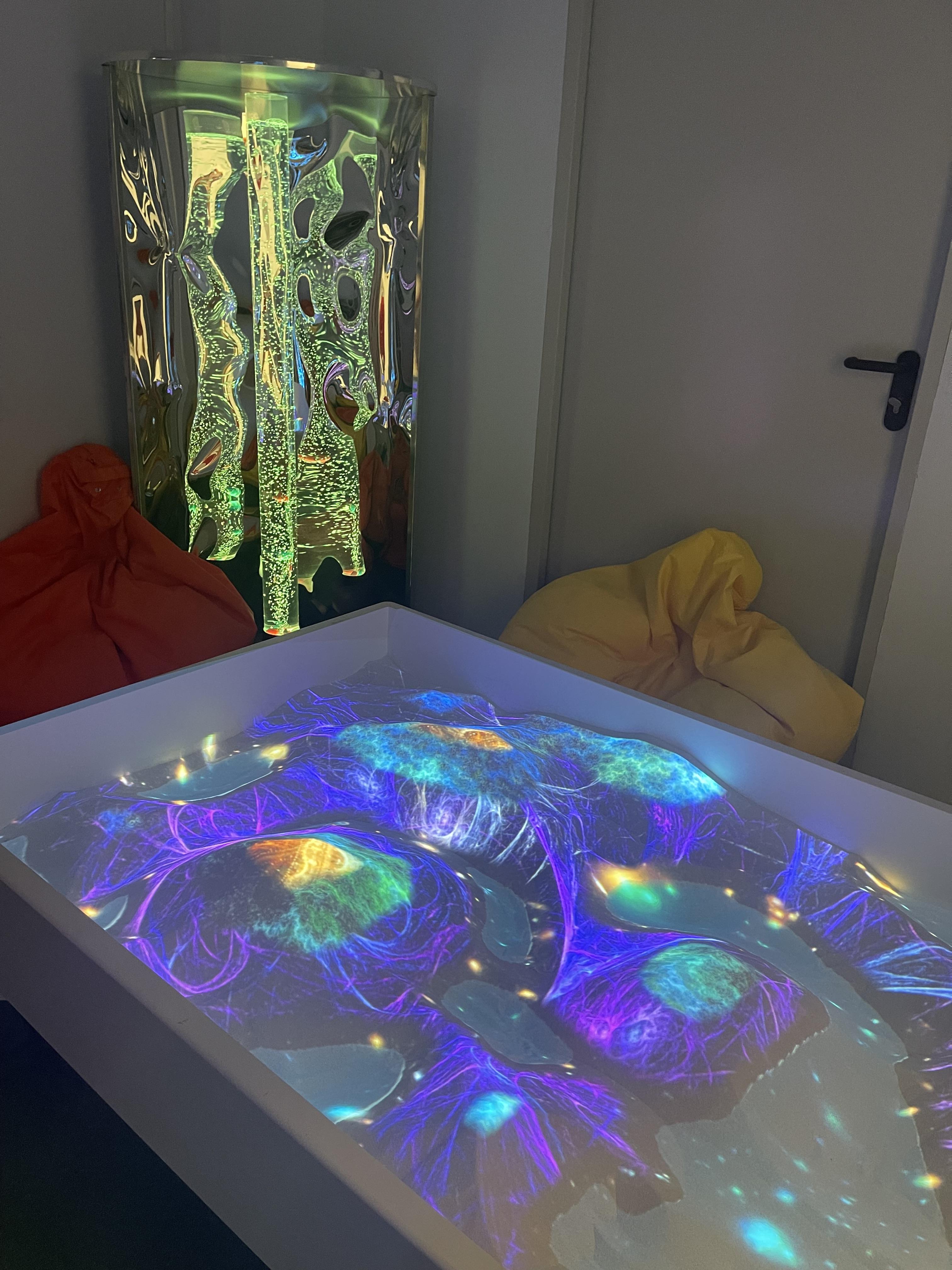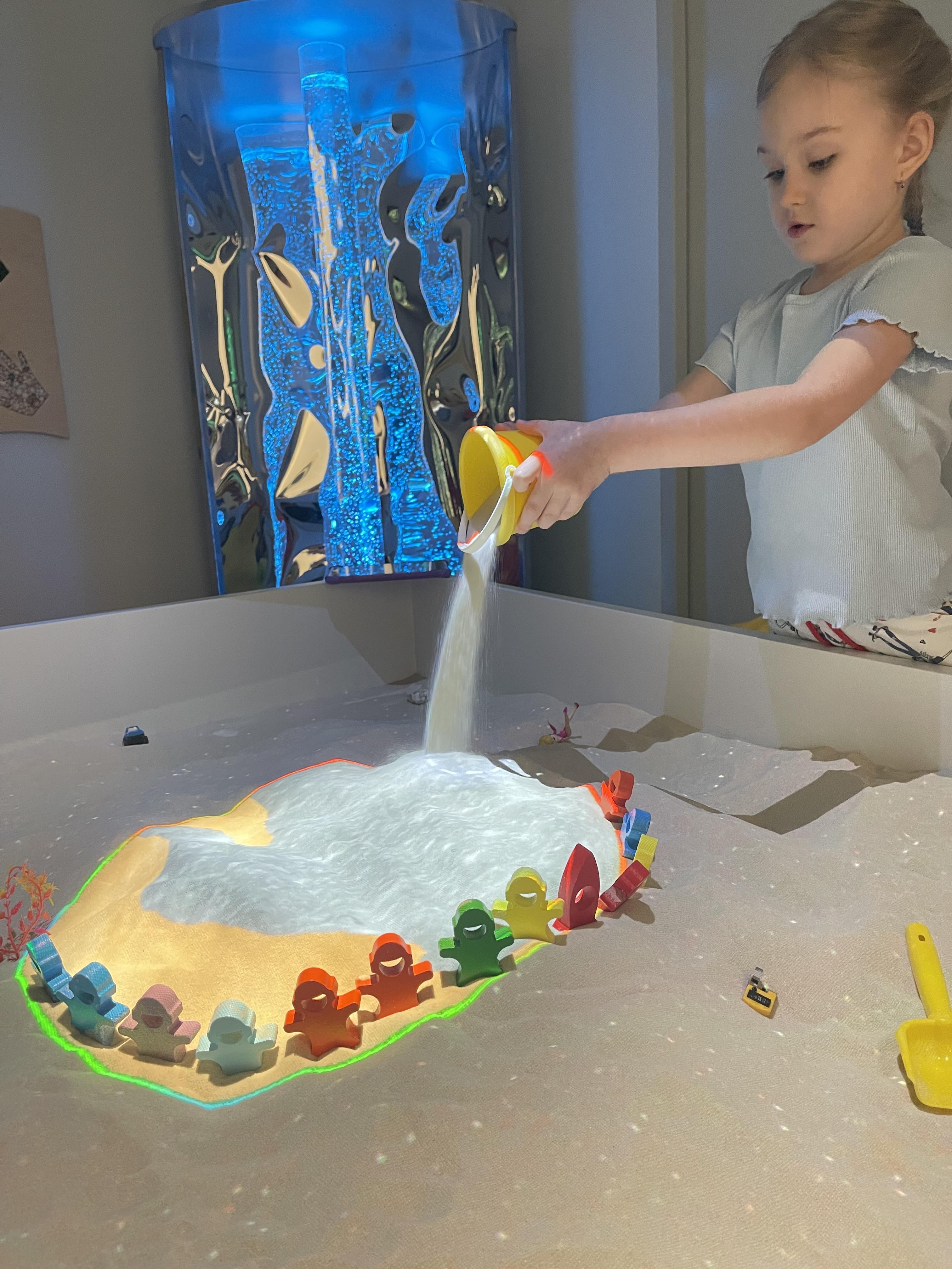 Занятия проводятся за закрытой дверью, освещение происходит за счет пузырьковых колонн и интерактивной песочницы, что делает Сенсорную комнату загадочной и волшебной. Такое пространство привлекает и расслабляет даже самых тревожных детей.