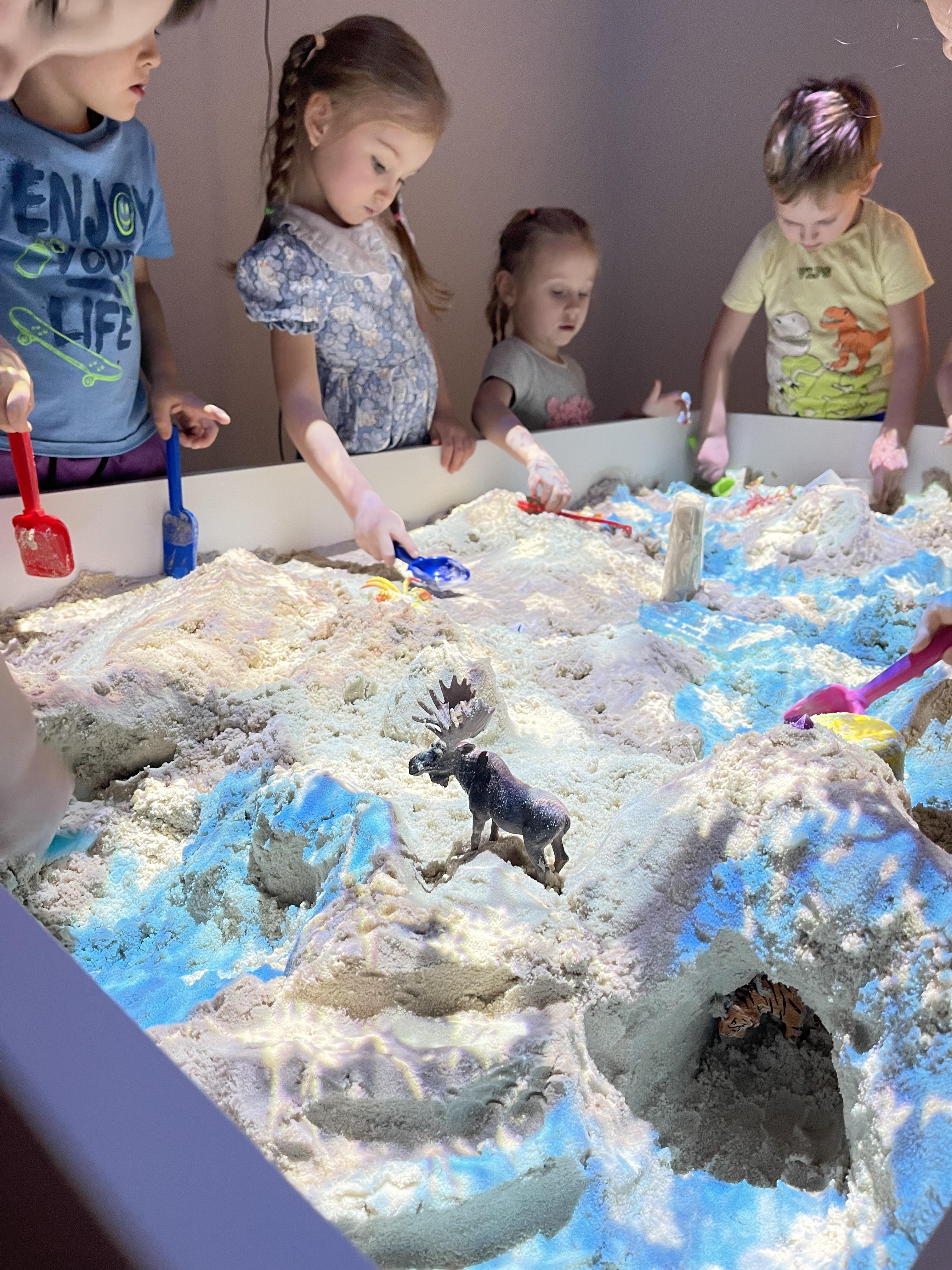 - ИНТЕРАКТИВНАЯ ПЕСОЧНИЦА – ЭТО УНИКАЛЬНОЕ ИЗОБРЕТЕНИЕ – на песочное поле проецируются «живые» сюжетные картины, с которыми дети могут взаимодействовать. Работа построена на технологиях дополненной реальности, благодаря чему обычный песок превращается в волшебную вселенную. Перед детьми открываются живописные пейзажи, которые он может перекроить в одно мгновение: выкопать озеро, построить вулкан или даже целый замок. Интерактивная песочница является маленькой моделью окружающего мира.