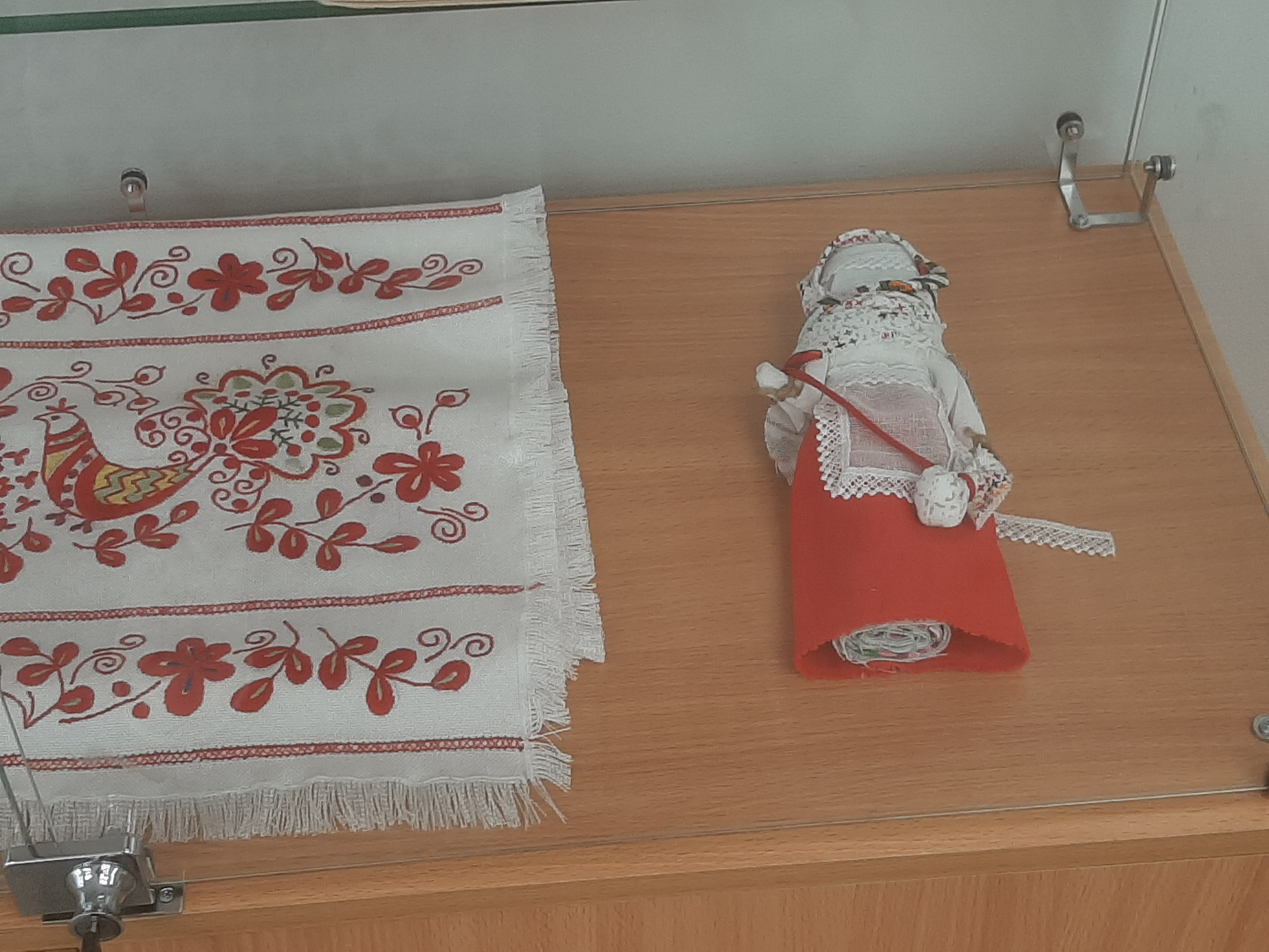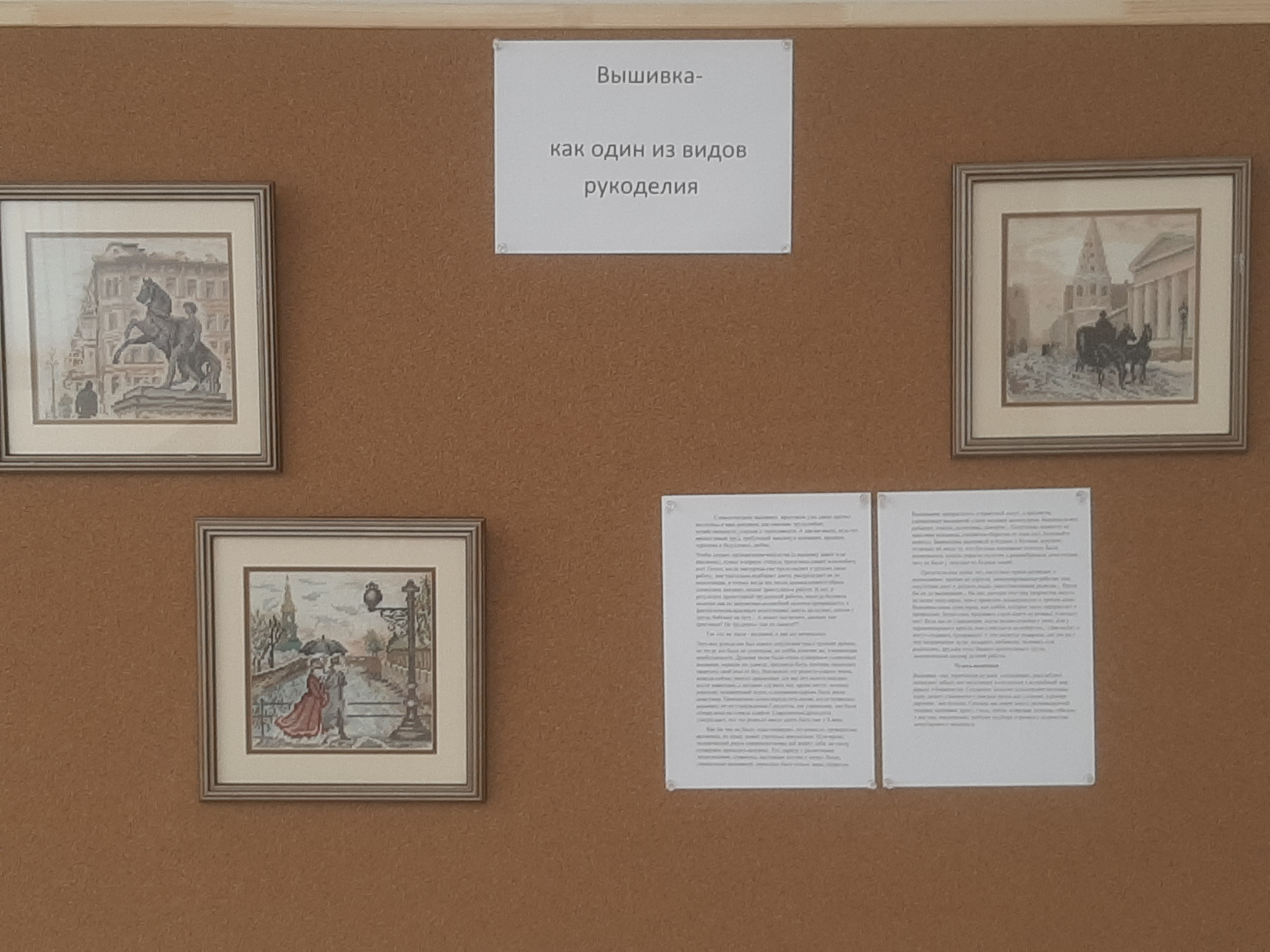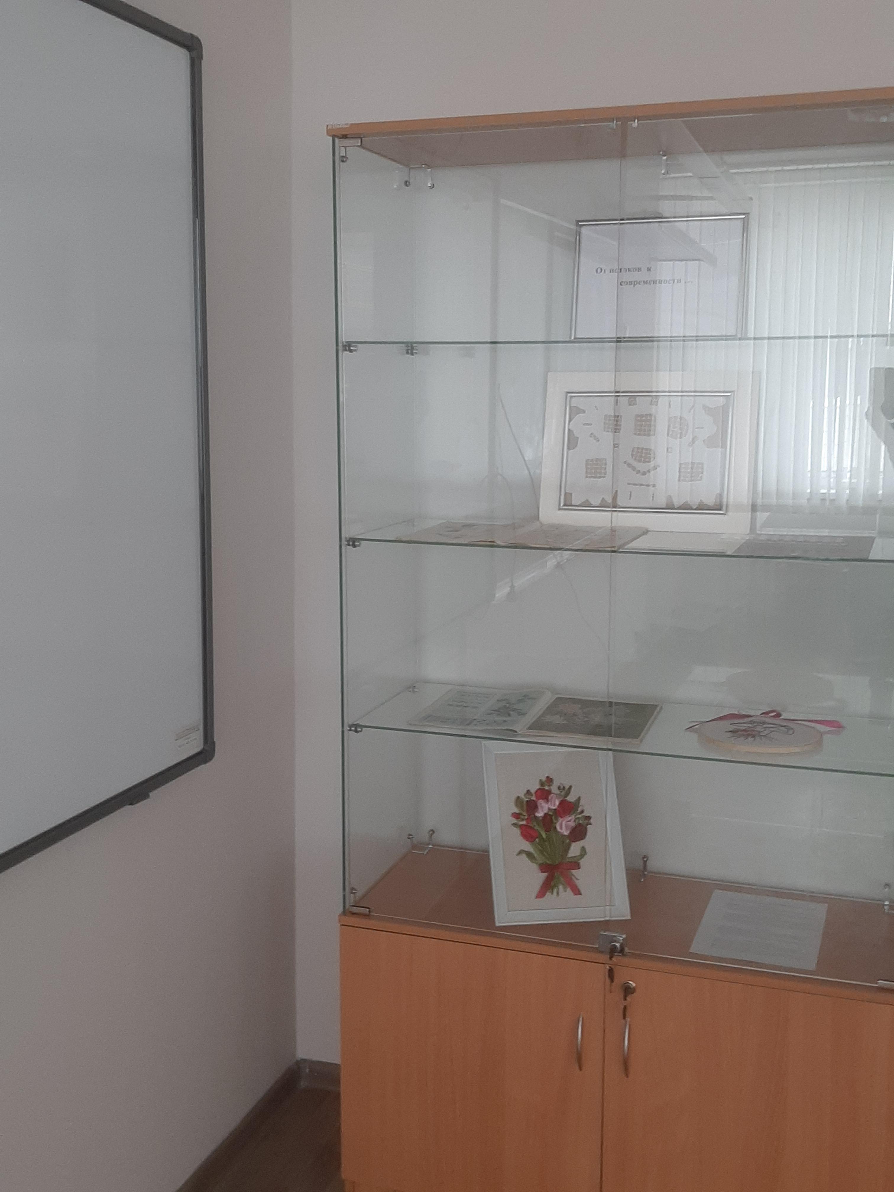 а) стенды с выставочными образцами видов рукоделия начала ХХ века ( вышивки, плетение),