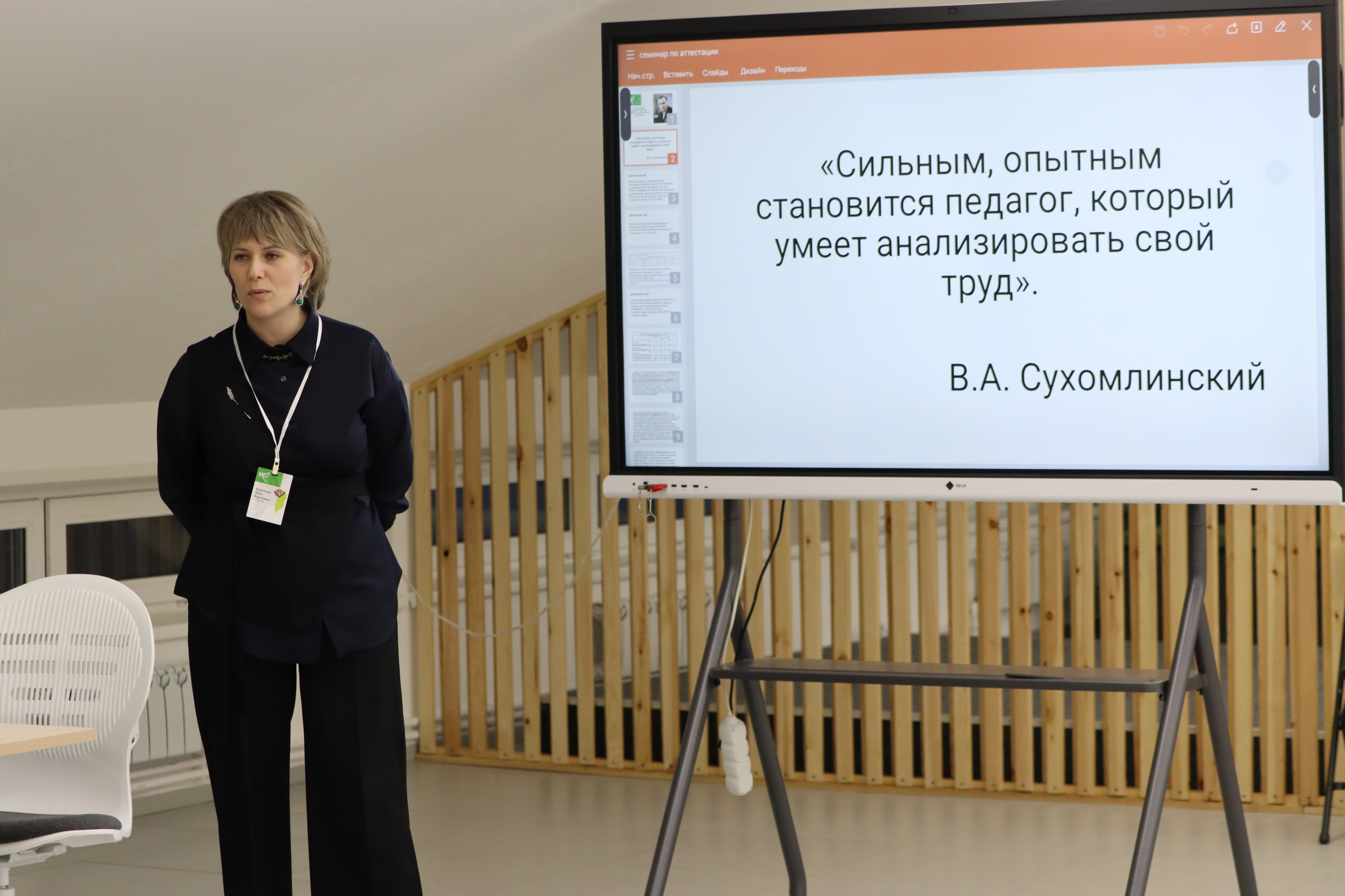 На семинаре учителя познакомились с новой системой аттестации педагогических кадров, рассмотрели критерии оценки педагогической деятельности, углубились в методические материалы, познакомились со способами анализа собственной деятельности, смогли поработать со структурой технологической карты урока.